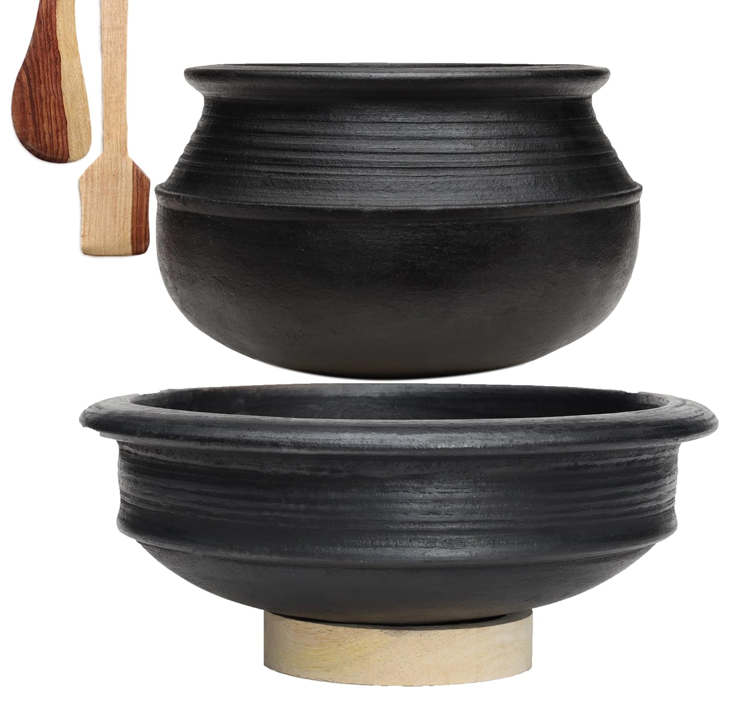 Deep Burned Uncoated Clay Handi + Pot Combo For Cooking & Serving With 2 Wooden Spatulas Complimentary Pack Of 2 - Black, 3+3 Liters | Pre-seasoned Mud Pot - Unglazed, Double Fired, Hand Crafted
