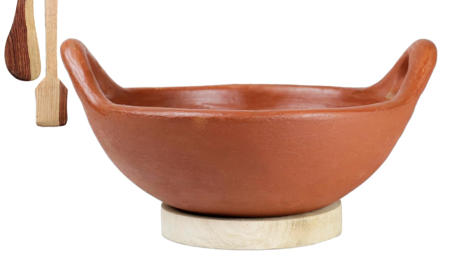 2 WOODEN SPATULAS COMPLIMENTARY ! Size : 1 LITER | Cooking Capacity : 500gm MEAT/VEG | Pre-Seasoned, Unglazed, Double fired, Hand Crafted,100% Organic BEST FOR: RICE, BIRYANI, PILAF, CURRIES -VEG,MEAT,FISH, PASTA, CHINESE.