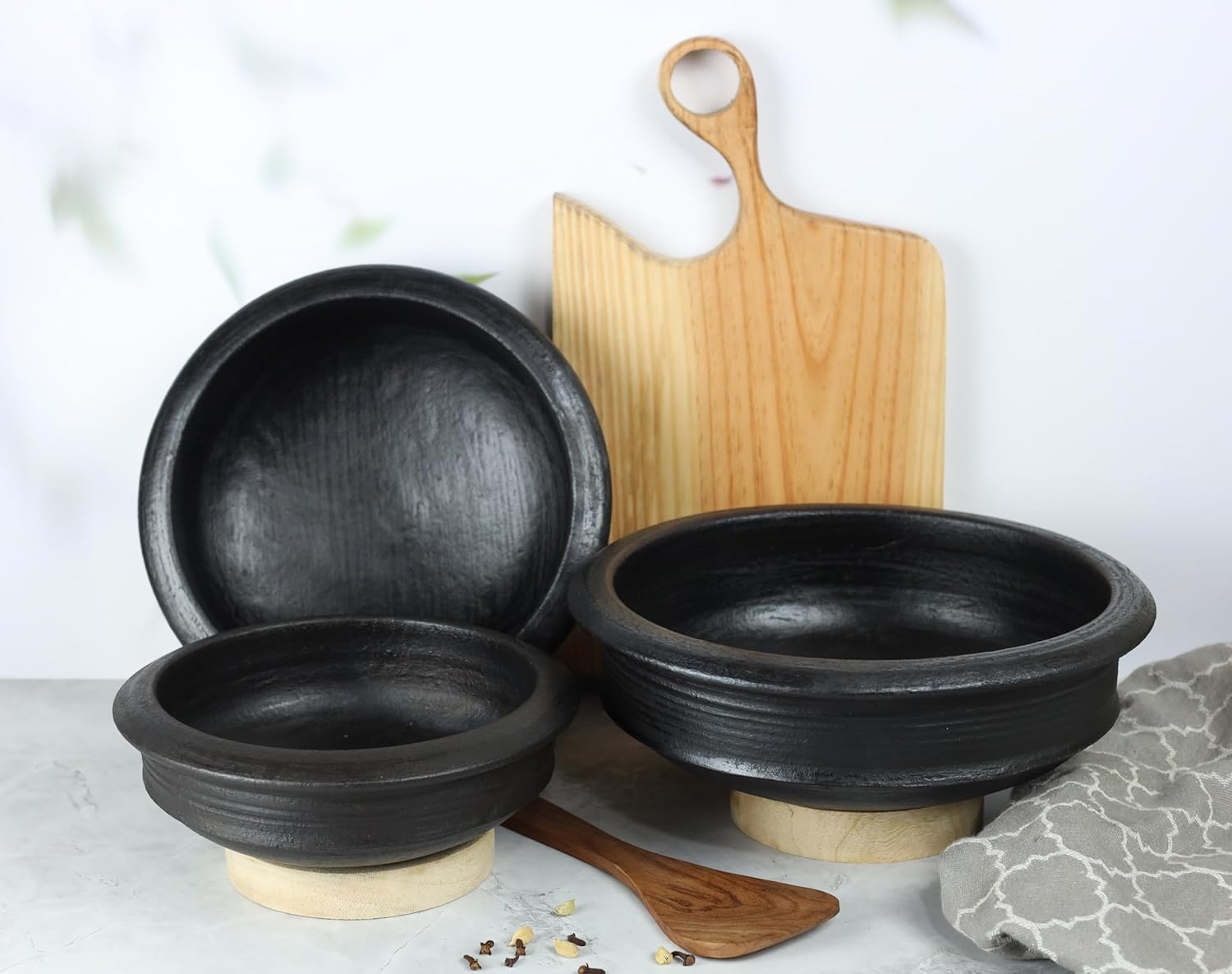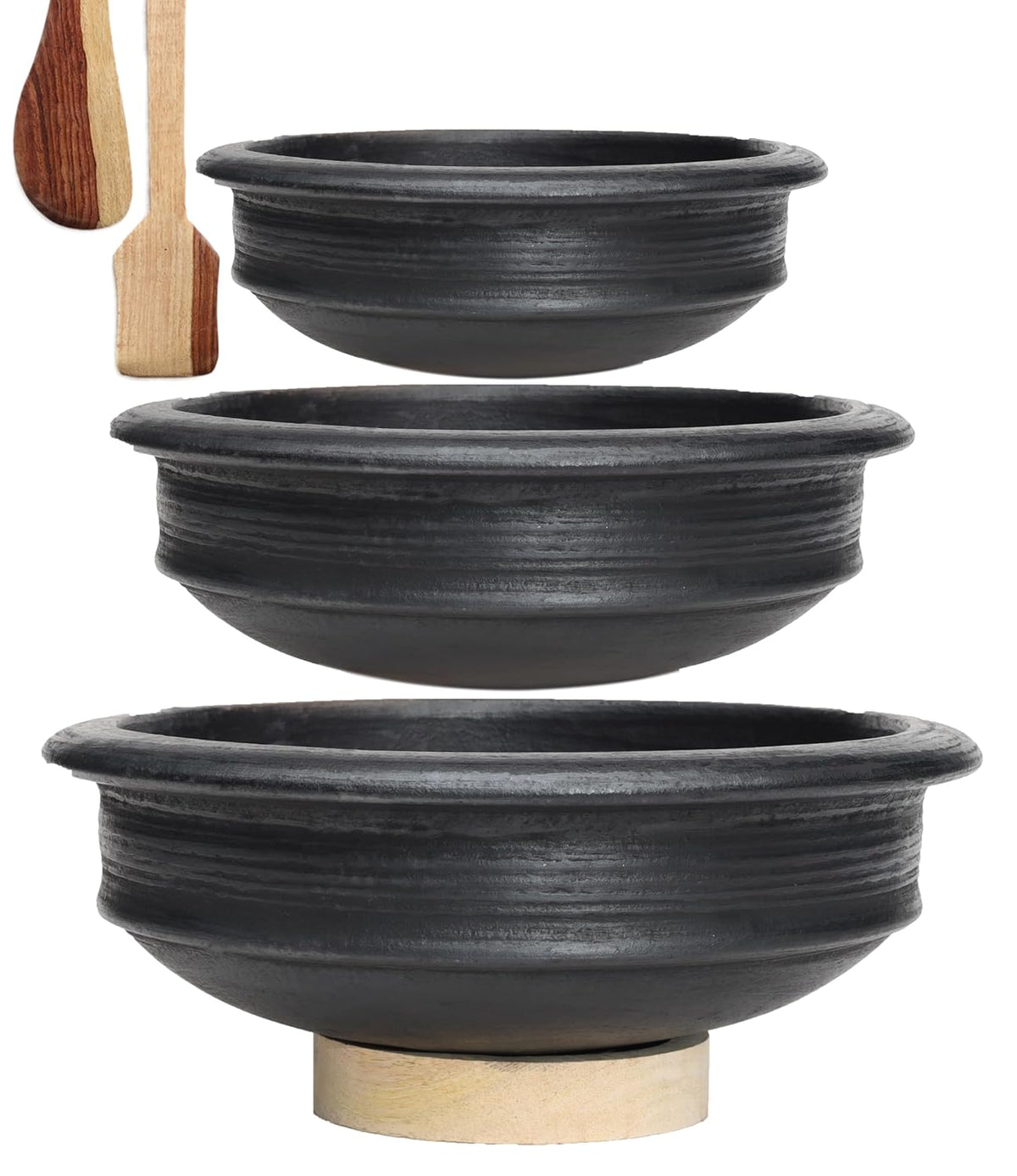 Deep Burned Uncoated Clay Pot Or Mitti Handi Combo With 2 Wooden Spatulas Complimentary Pack Of 3 - Black, 1+2+3 Liters | Pre-seasoned Mud Pot - Unglazed, Double Fired, Hand Crafted