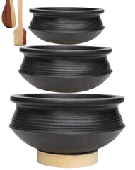 Deep Burned Uncoated Clay Pot Or Mitti Handi Combo With 2 Wooden Spatulas Complimentary Pack Of 3 - Black, 1+2+4 Liters | Pre-seasoned Mud Pot - Unglazed, Double Fired, Hand Crafted