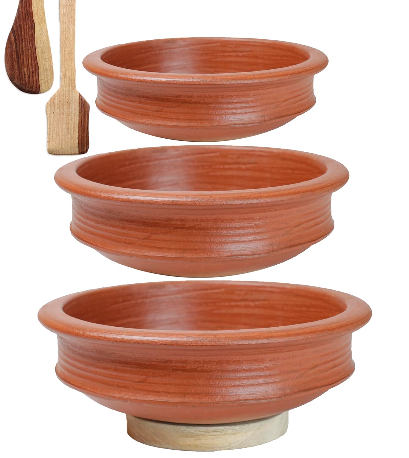 Deep Burned Uncoated Clay Pot Or Mitti Handi Combo With 2 Wooden Spatulas Complimentary Pack Of 3 - Red, 1 + 2 + 3 Liters | Pre-seasoned Mud Pot - Unglazed, Double Fired, Hand Crafted