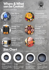 KNOW YOUR PRODUCT- Hand a hand made product, Size and shape may slightly vary. More sand added in clay for Extra Strength, Durability and Long lasting. PRE-SEASONED- This product is seasoned using Corn Starch. Seasoning starch may appear Glossy and Slippery on surface. BLACK POTTERY_ Pots attain Black colour naturally during DEEP BURNING process due to temperature change in the kiln. Red pots may turn Black & Black pots may turn Red while cooking due to temperature change where the flame hits.