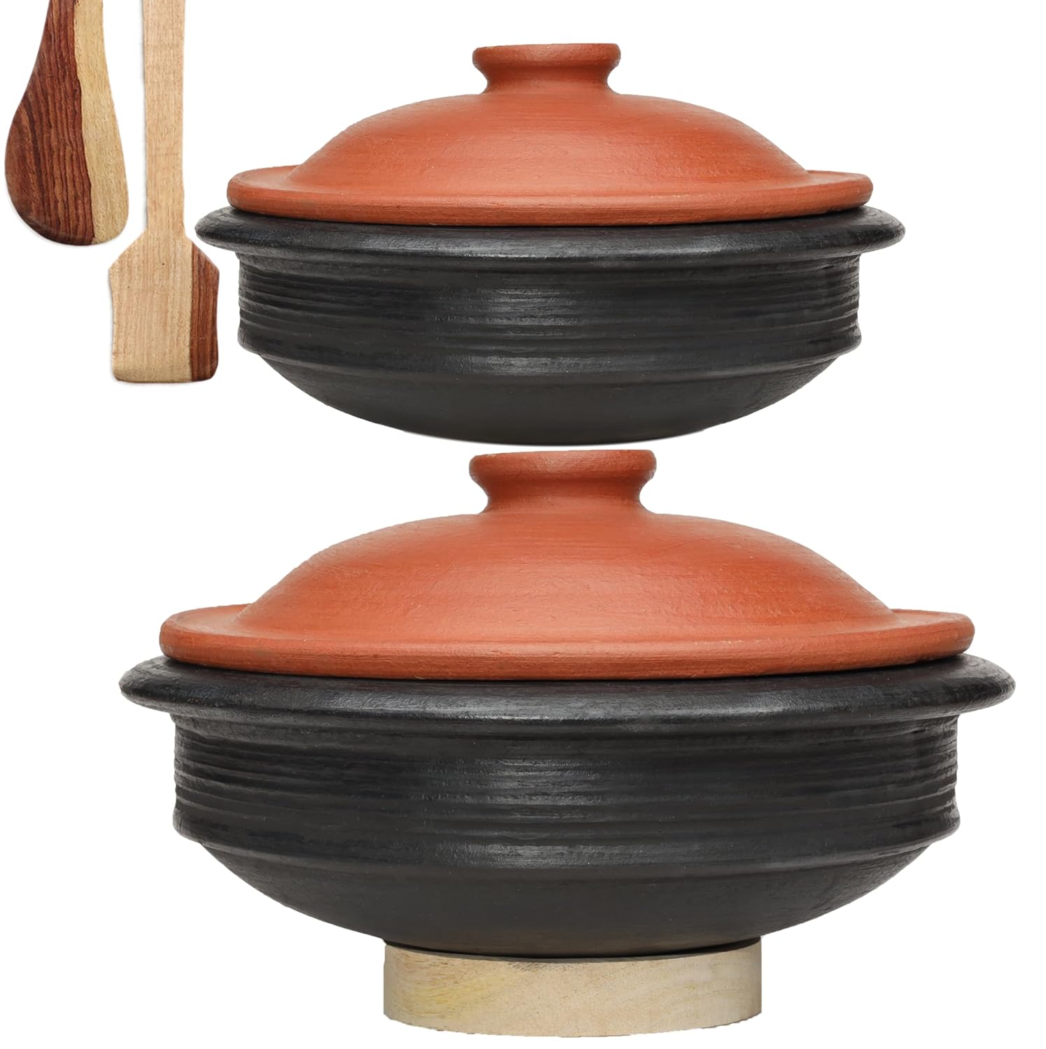 Deep Burned Uncoated Clay Pot Or Mitti Handi With Lid Combo + 2 Wooden Spatulas Complimentary Pack Of 2 - Black, 1+3 Liters | Pre-seasoned Mud Pot - Unglazed, Double Fired, Hand Crafted