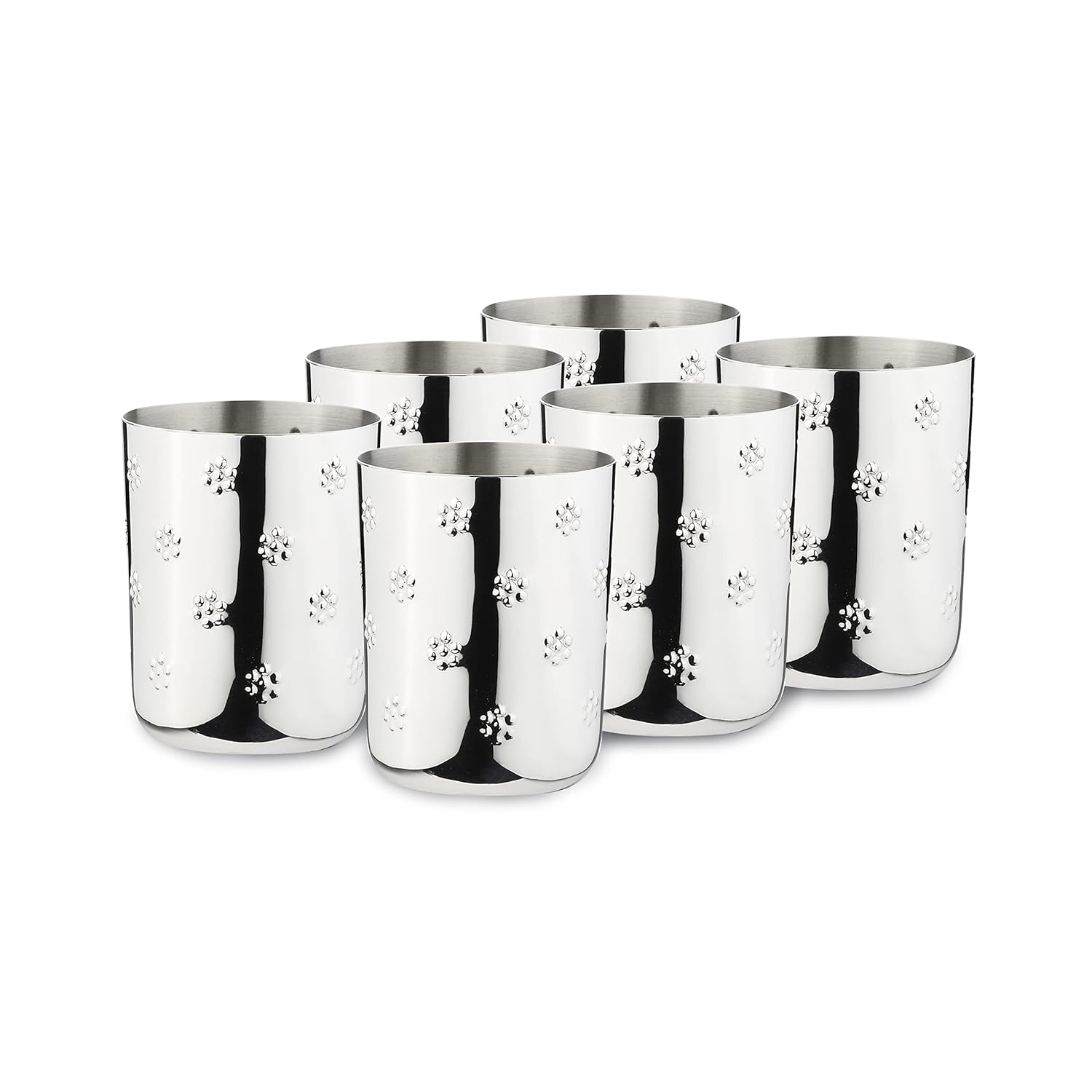 Designer Chrome Stainless Steel Drinking Glass Set Of 6 | Flower Pattern | Convenient Water Glasses | Multipurpose Designer Tumbler | Serve Ware & Tableware | Polka Series