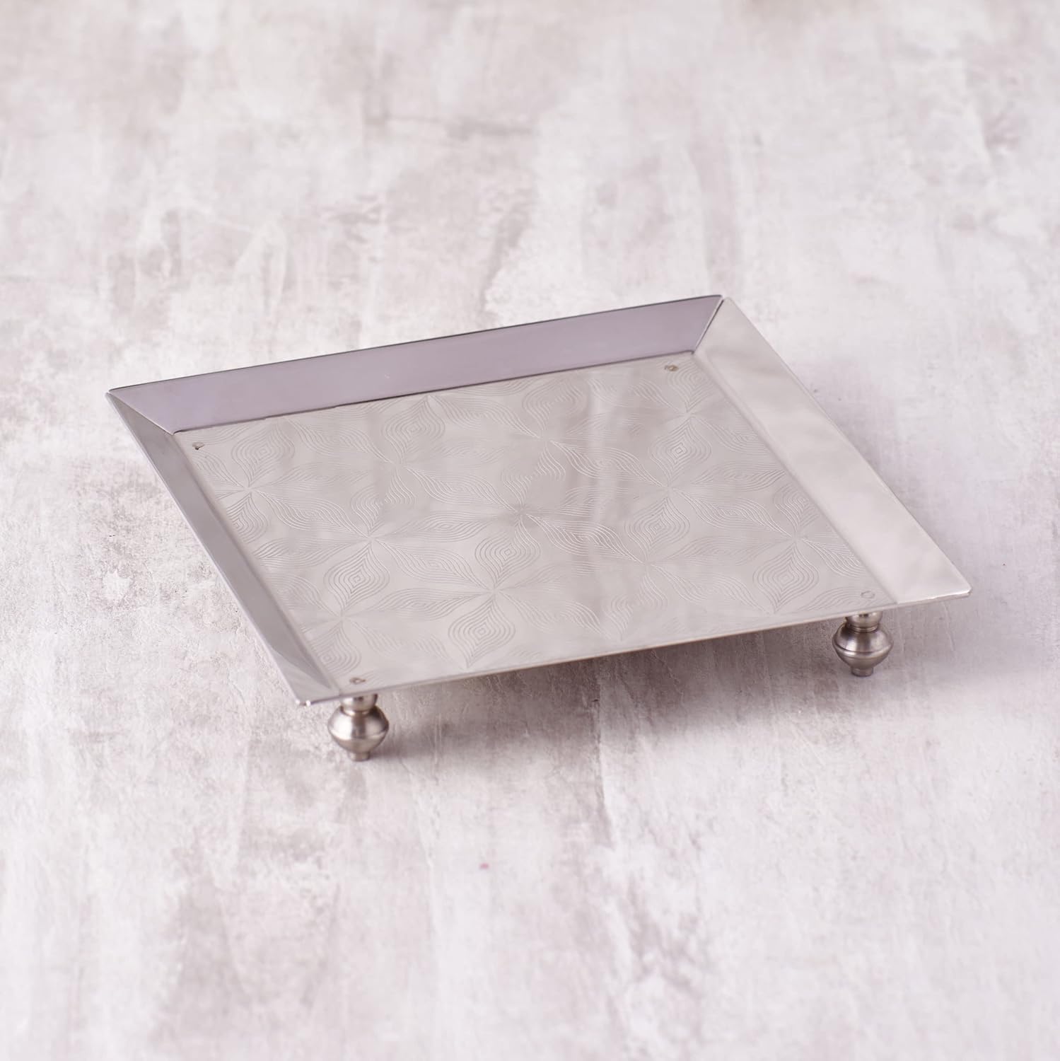 Designer Chrome Stainless Steel Square Platters With Legs | Serving Tray For Food Dessert Fruit Coffee Tea | Square Engraved Pattern, Large