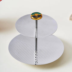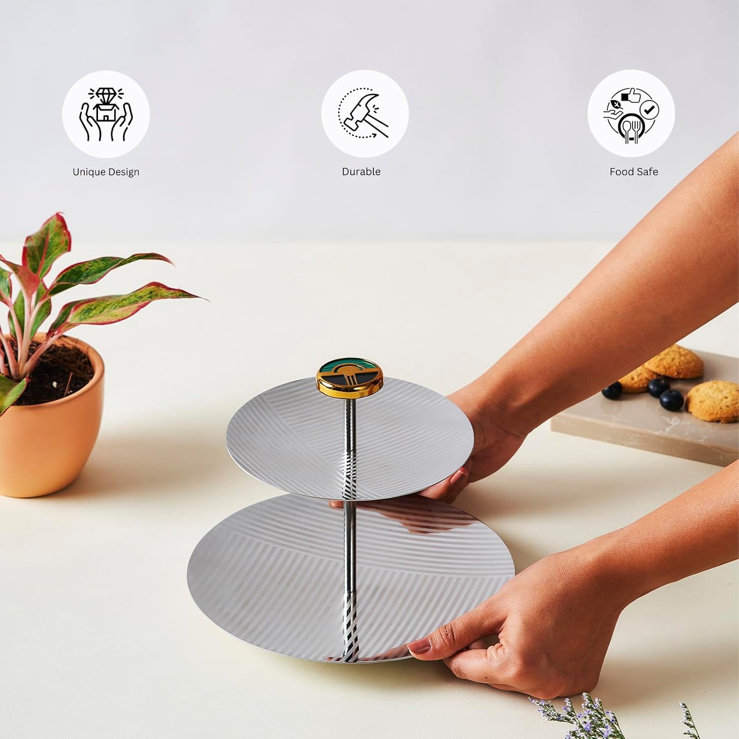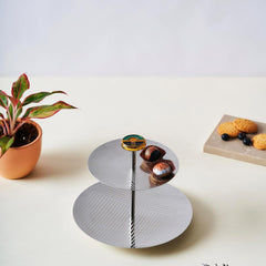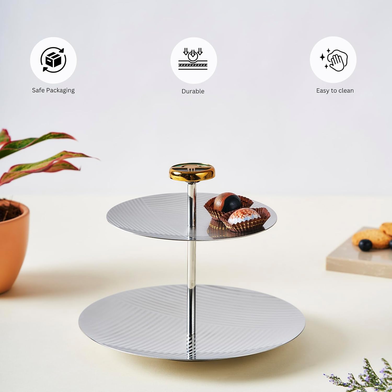 Designer Silver Stainless Steel Round Two Tier Platter | Cup Cake Platter Stand | Geometric Patterns | 2 Layer Serving For Party Entertaining Food Display Fruit Dessert | Premium Serve Ware, Dinnerware & Tableware | Deco Series