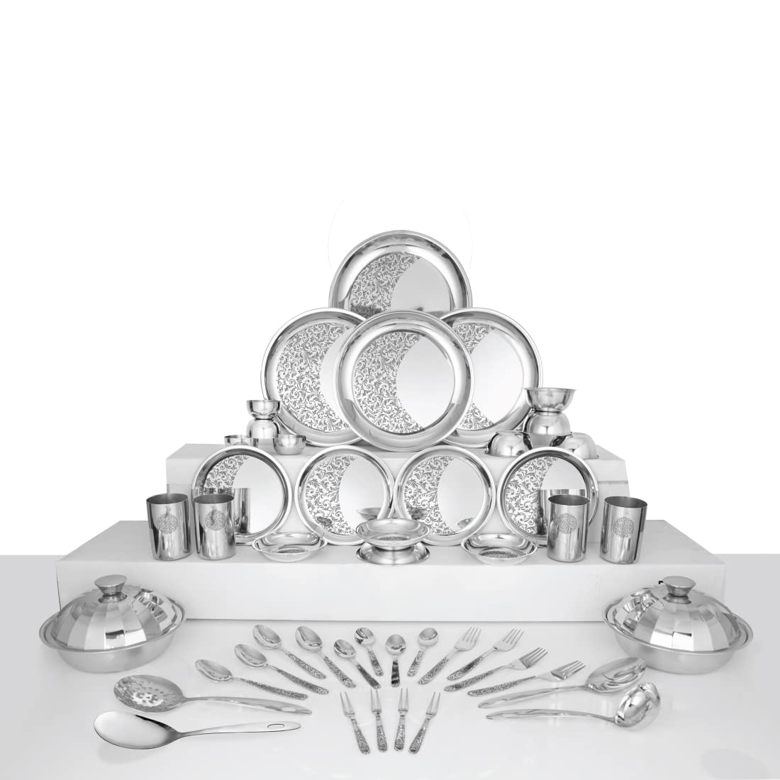 Designer Stainless Steel Delight Laser Bloom Dinner Set Of 46 Pieces, Silver | Dishwasher Safe