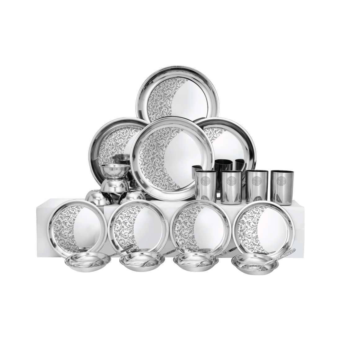 Designer Stainless Steel Delight Laser Bloom Leaf Dinner Set Of 24 Pieces, Silver | 4 Dinner Plates+ 4 Side Plates+ 4 Glasses+ 4 Bowls+ 4 Pudding Bowls+ 4 Dessert Spoons