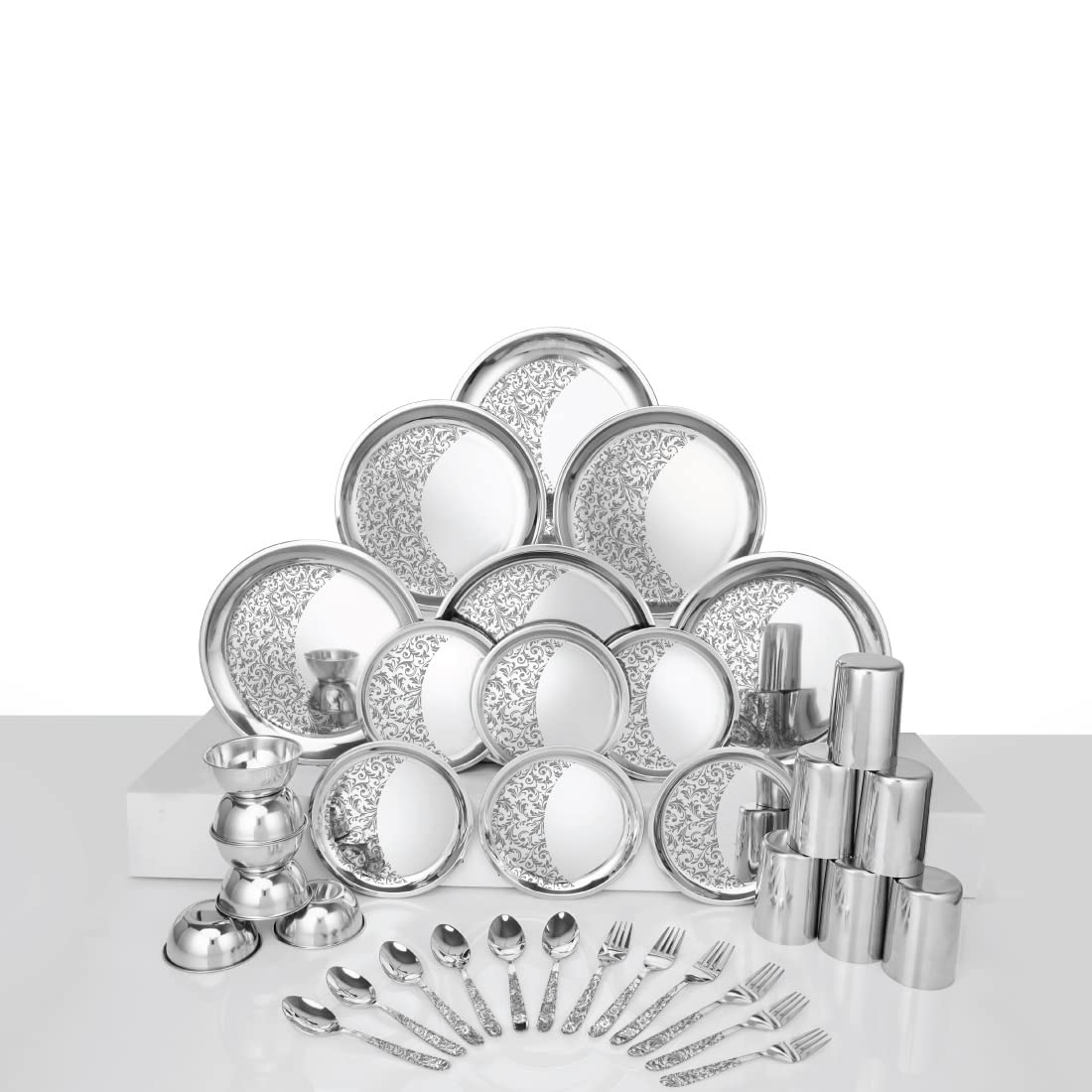 Designer Stainless Steel Delight Laser Bloom Leaf Dinner Set Of 36 Pieces, Silver | 6 Dinner Plates+ 6 Side Plates+ 6 Glasses+ 6 Bowls+ 6 Dessert Spoons+ 6 Dessert Fork