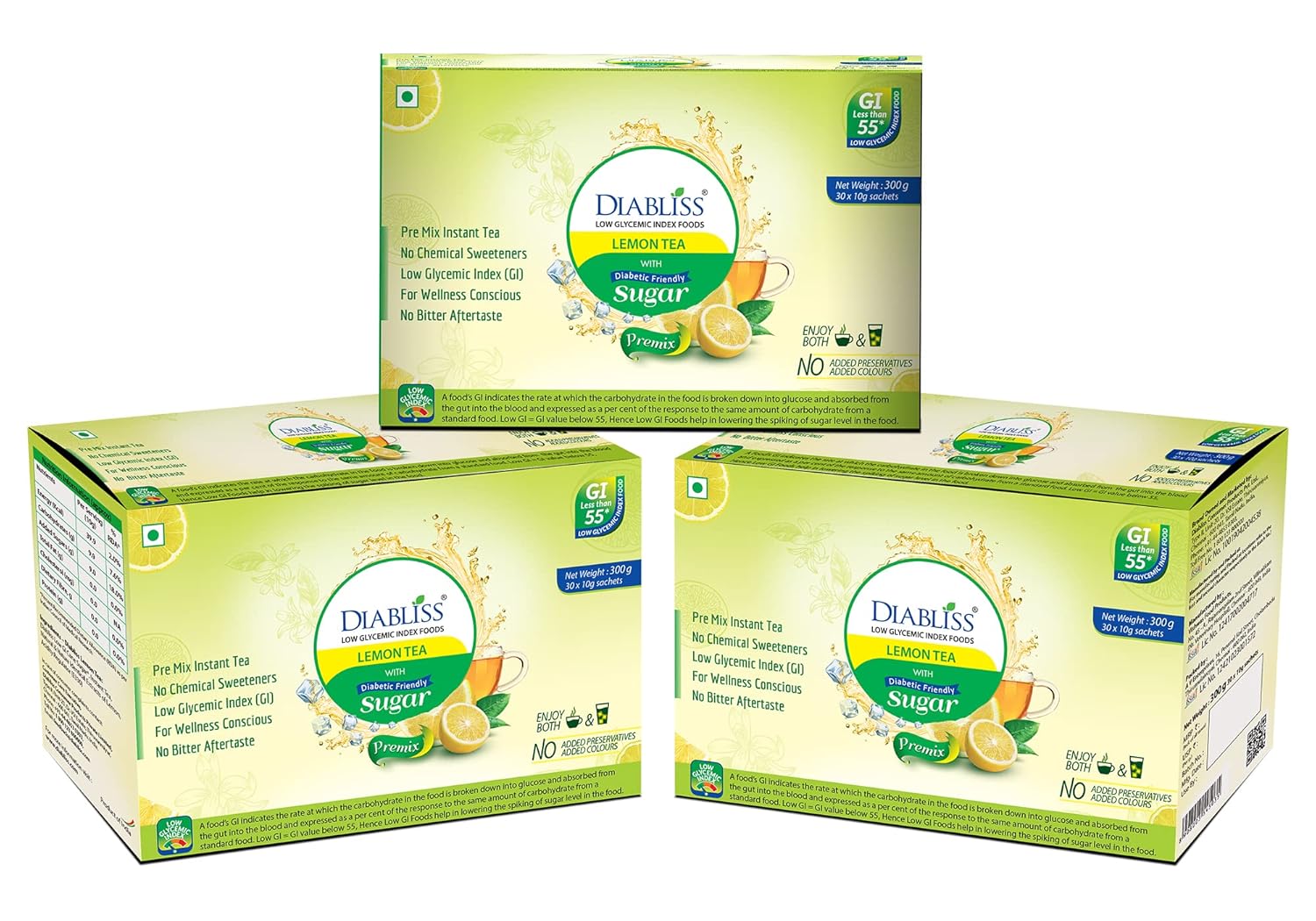 Diabliss Premix Instant Lemon Green Tea With Diabetic Friendly Sugar - 90 Sachets, Pack Of 3 X 300gm, 10.5 Ounce Each | Low Glycemic Index, No Chemical Sweeteners - Caffeine Free