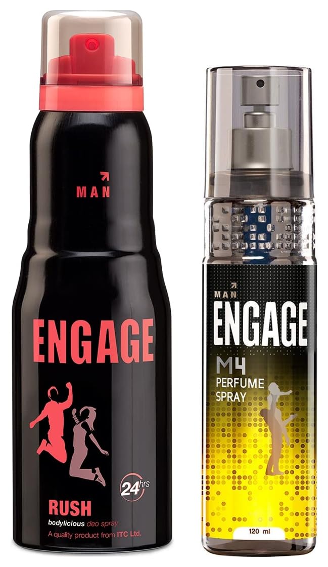 Engage M4 Perfume Spray For Men, 120mlEngage Has Introduced A New Range Of Perfume Sprays For Men & Women. Crafted By International Experts This Range Delivers Strong And Long Lasting Fragrances. This Range Has Been Launched In A Clear Transparent Packaging.Engage Man Deodorant, Rush, 150ml / 165ml (Weight May Vary)Engage Man Deo Rush for men who have a bold, modern look and has been designed in classical black with a tinge of effervescent colours. It provides 24 hour freshness and has been crafted to enhance their personal grooming and confidence