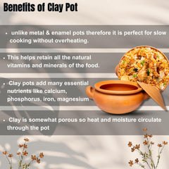 Benefits- Clay is somewhat porous so heat and moisture circulate through the pot, unlike metal & enamel pots therefore it is perfect for slow cooking without overheating. This helps retain all the natural vitamins and minerals of the food. Clay pots add many essential nutrients like calcium, phosphorus, iron, magnesium and sulphur to food.