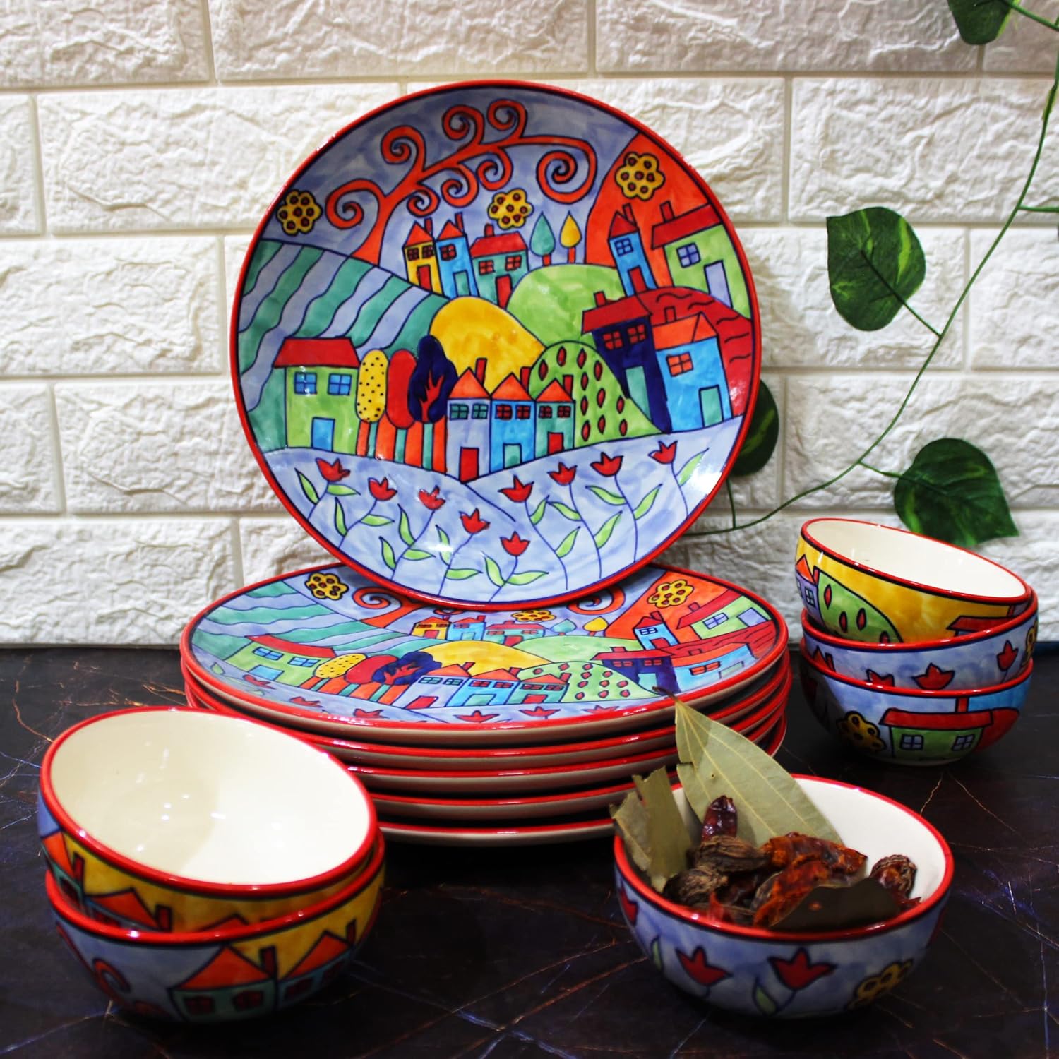 Exotic Panorama Hand Painted Ceramic Dinner Set - 12 Pieces | 6 Dinner Plates + 6 Katori Bowls, 180ml Each Dinnerware Set | Serving For 6, Microwave Safe & Dishwasher Safe