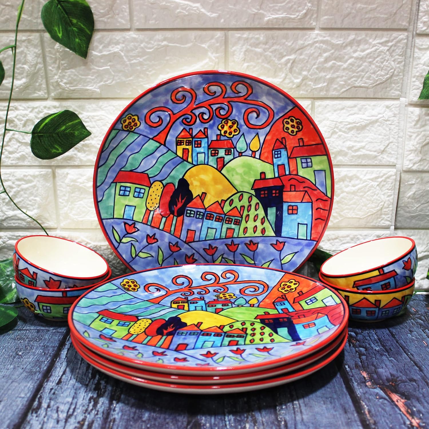 Exotic Panorama Hand Painted Ceramic Dinner Set - 8 Pieces | 4 Dinner Plates + 4 Katori Bowls, 180ml Each Dinnerware Set | Serving For 4, Microwave Safe & Dishwasher Safe