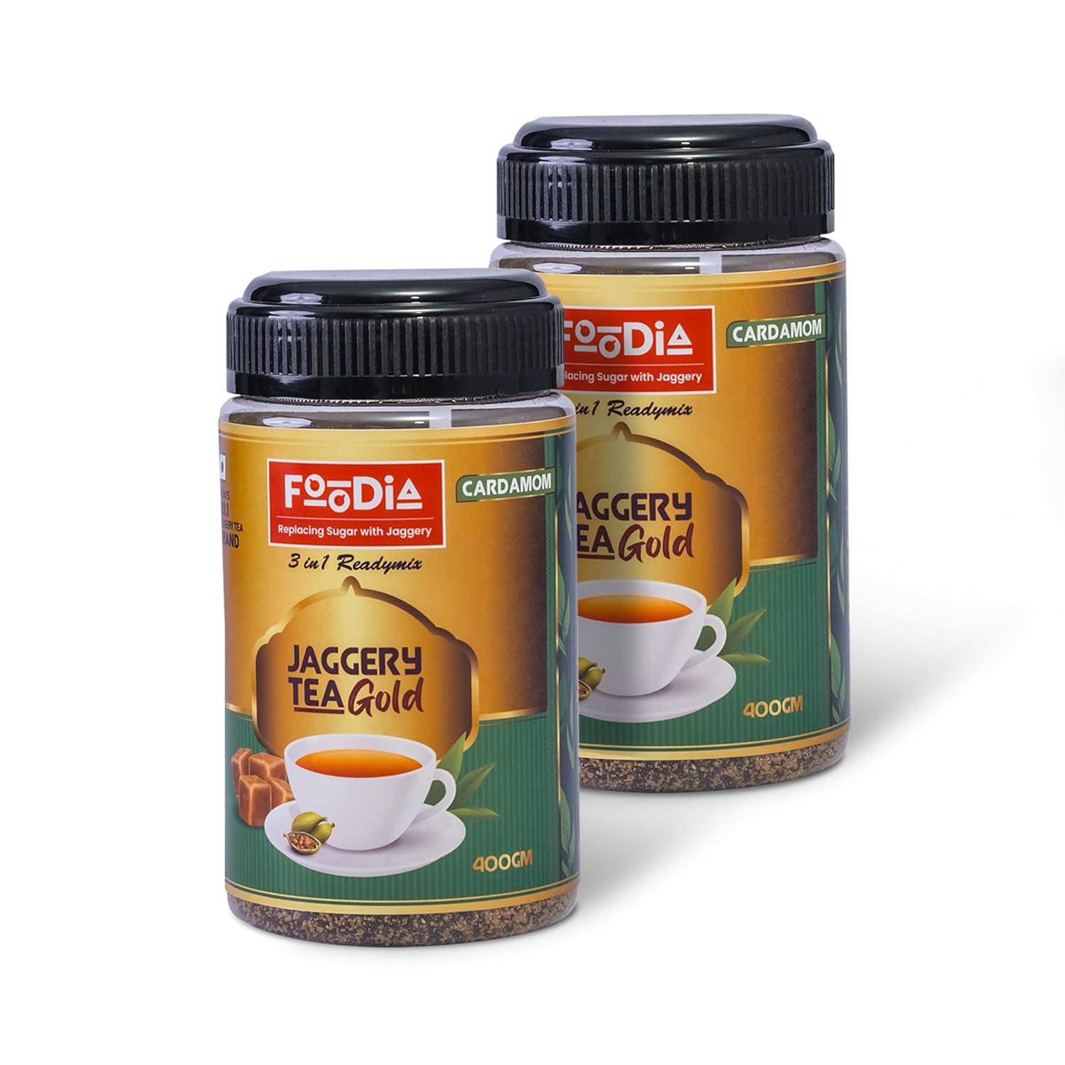 Foodia Gold Jaggery Cardamom Tea 3 In 1 Readymix - Pack Of 2 X 400gm, 14.1 Ounce Each | Premium Tea Mix With Jaggery, Cardamom & Assam Tea - Elaichi Chai Mix, Cardamom Tea Mix | Low Caffeine