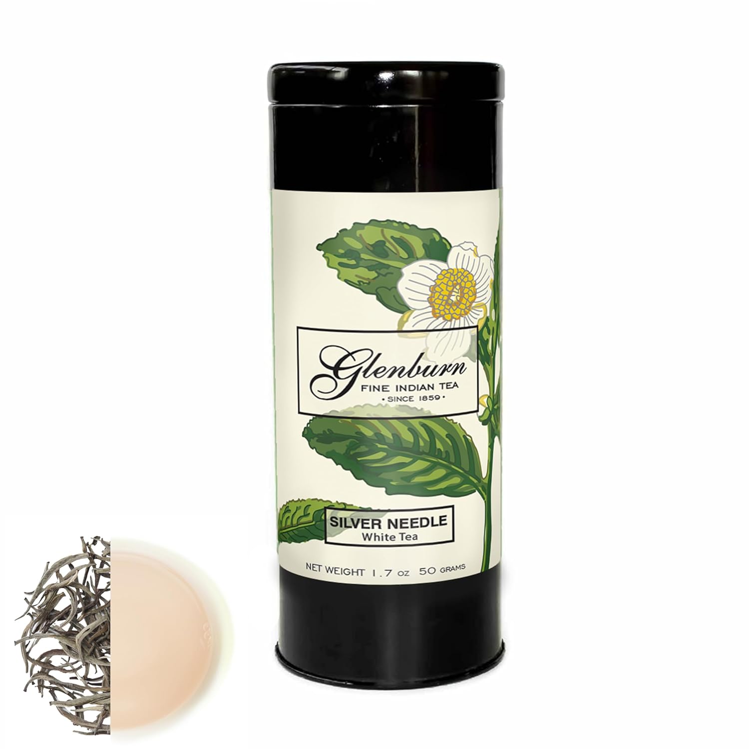 Glenburn Silver Needle White Tea - 50gm Tin, 1.7 Ounce | Rich Ethereal Flavor Premium Loose Leaf - Prized Clonal Shoots | Fine Indian Tea