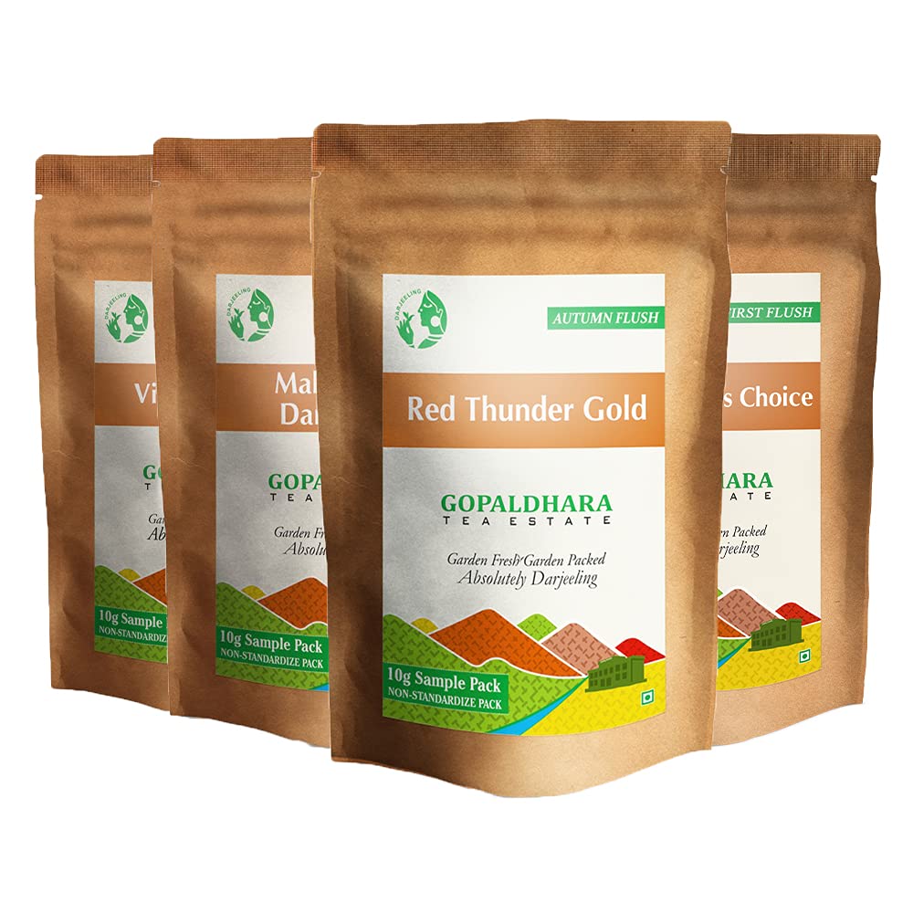 Gopaldhara Royal Collection Of Darjeeling Tea Sample Pouches - Pack Of 4 Teas X 10gm, 0.35 Ounce Each | Second Flush+ First Flush+ Autumn Flush+ Green Tea - Low Caffeine Loose Leaves