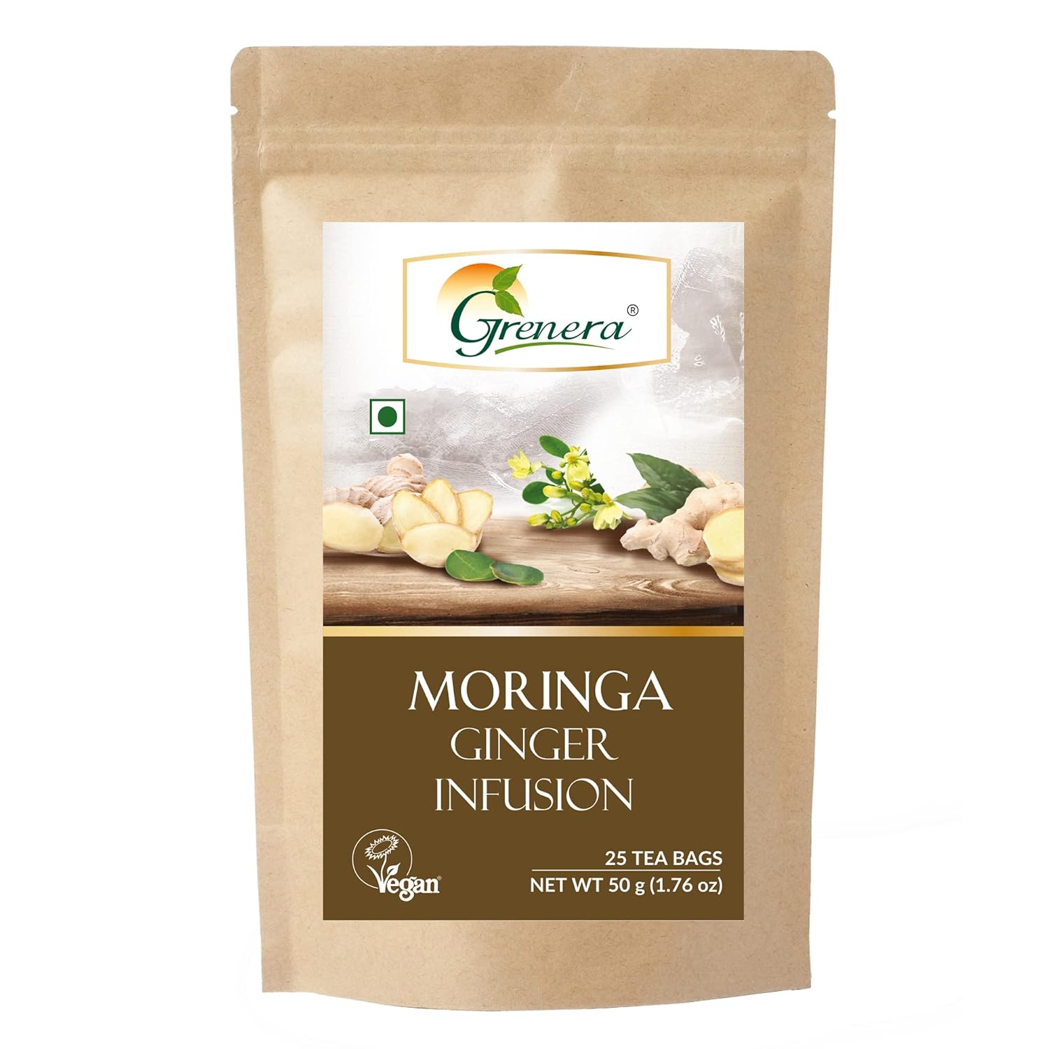 Grenera Moringa Ginger Infusion Tea - 25 Tea Bags | Herbal Dietary Supplement - Caffeine Free, Non-GMO, Gluten Free, Staple Free