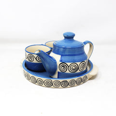 Hand Painted Blue Swirl Tea Set With Kettle | Ceramic Tea Kettle Set With 2 Cups, 150ml Each + 1 Kettle, 400ml + 1 Tray | 4 Pieces - Microwave Safe & Dishwasher Safe