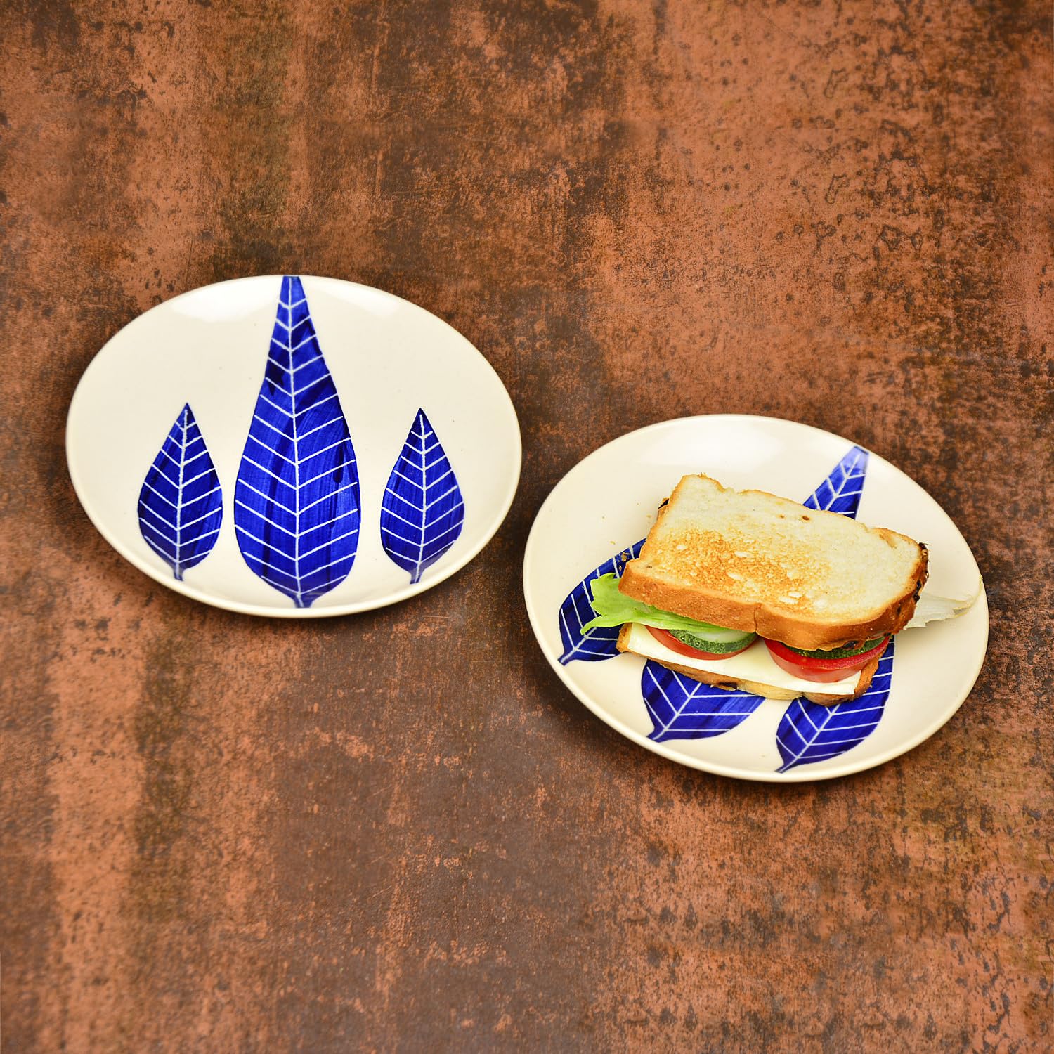 Hand Painted Ceramic Blue Leaf Quarter Plates Set Of 2 - 7 Inches, Blue & White | Dishwasher Safe Small Side Plates | Microwave Safe Snack Plates