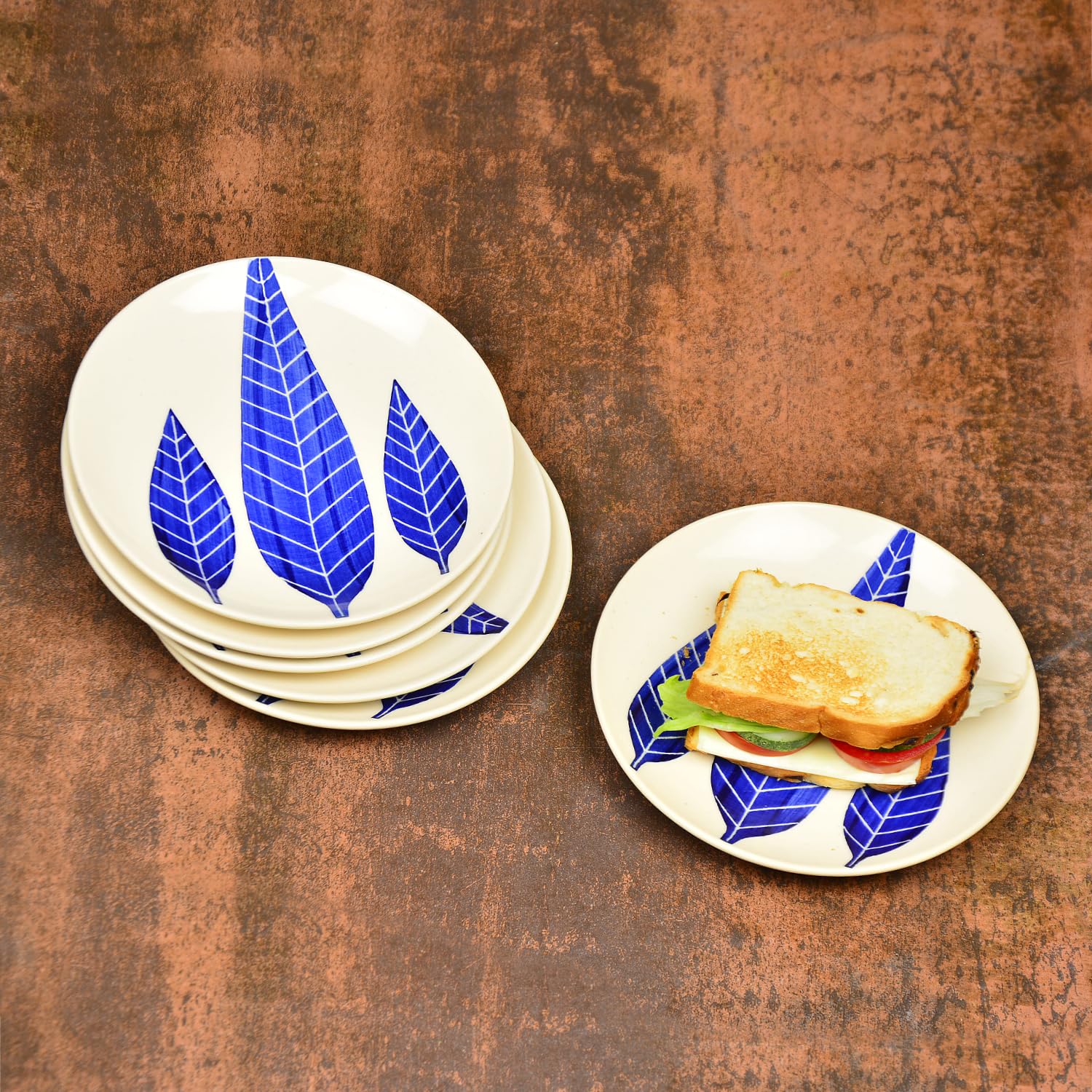 Hand Painted Ceramic Blue Leaf Quarter Plates Set Of 6 - 7 Inches, Blue & White | Dishwasher Safe Small Side Plates | Microwave Safe Snack Plates