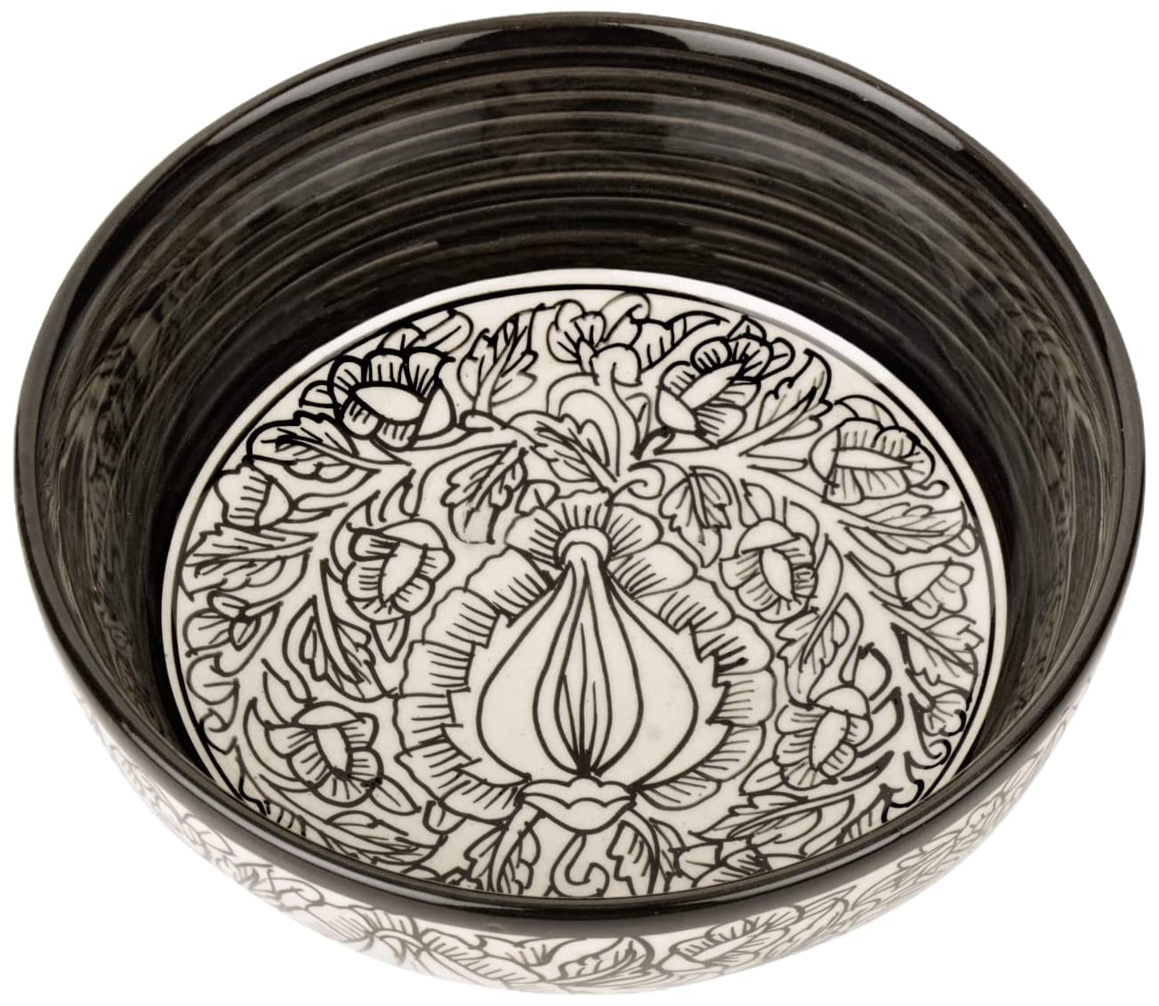 Hand Painted Ceramic Bowl - Off White & Black, Diameter - 17 Cm, 750ml | Salad Bowl | Pasta Serving Bowl | Snack Bowl - Kalamkaari Collection