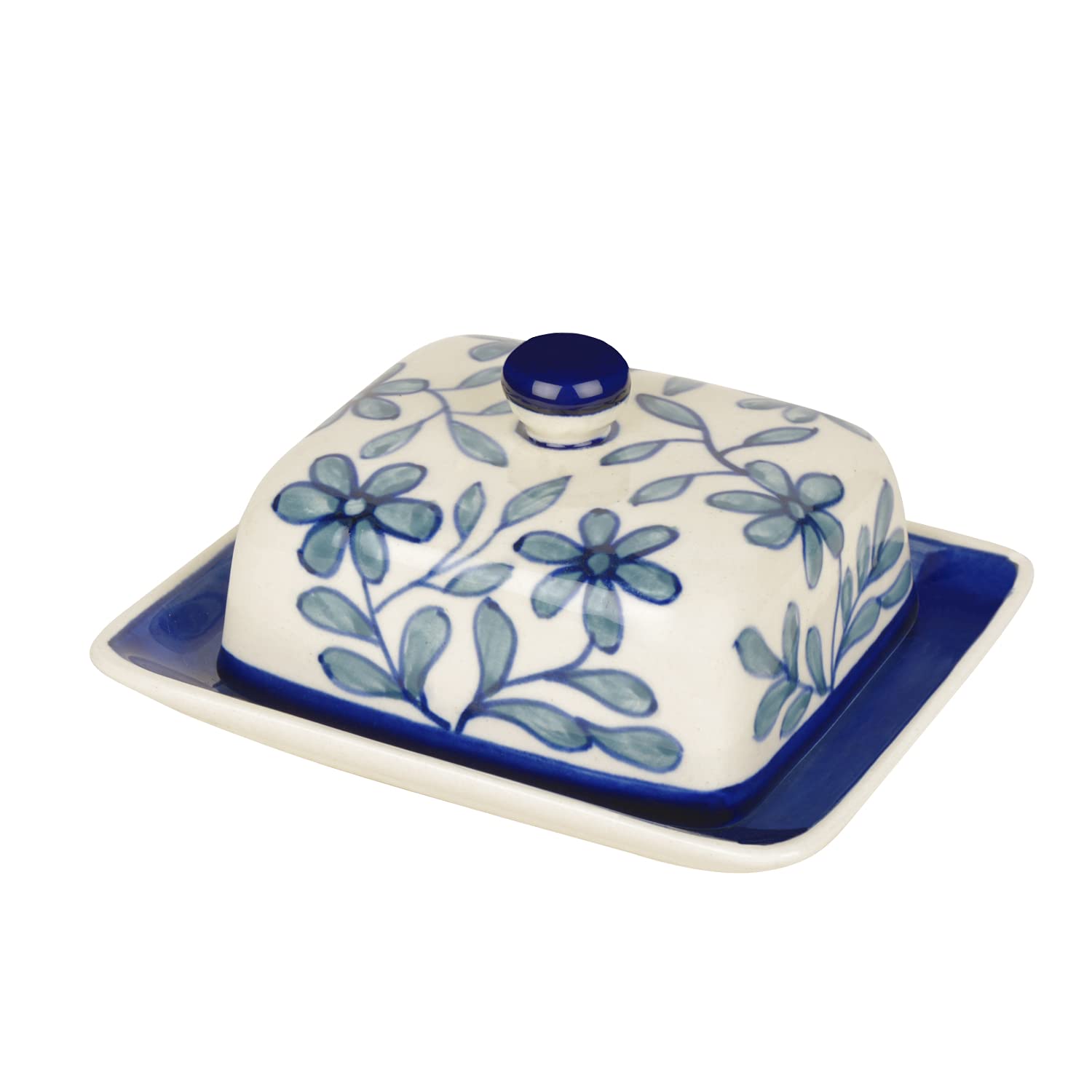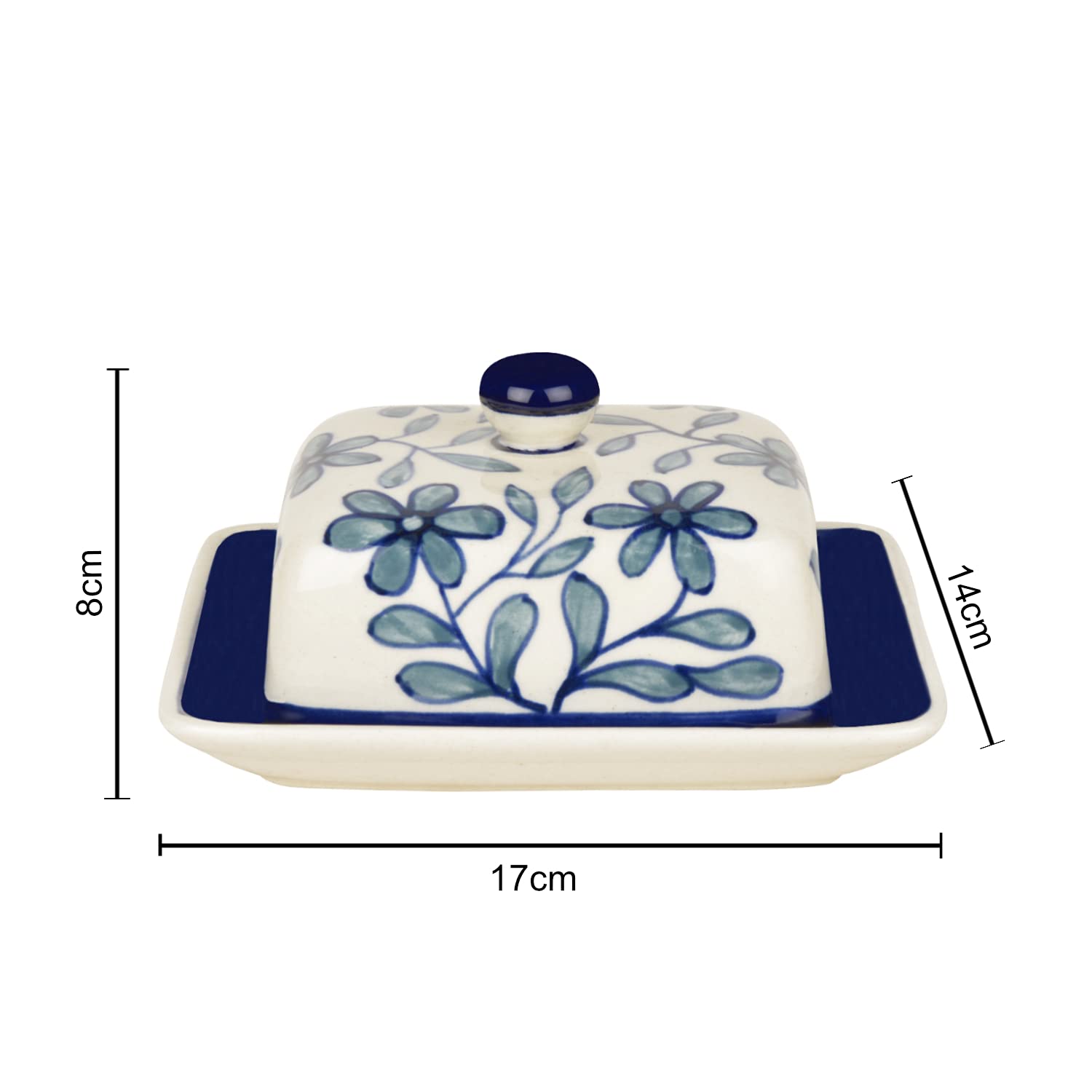 Hand Painted Ceramic Butter Dish With Lid - Blue & White, Height: 8 Cm | Butter Serving Set | Butter Container For 500 Gm