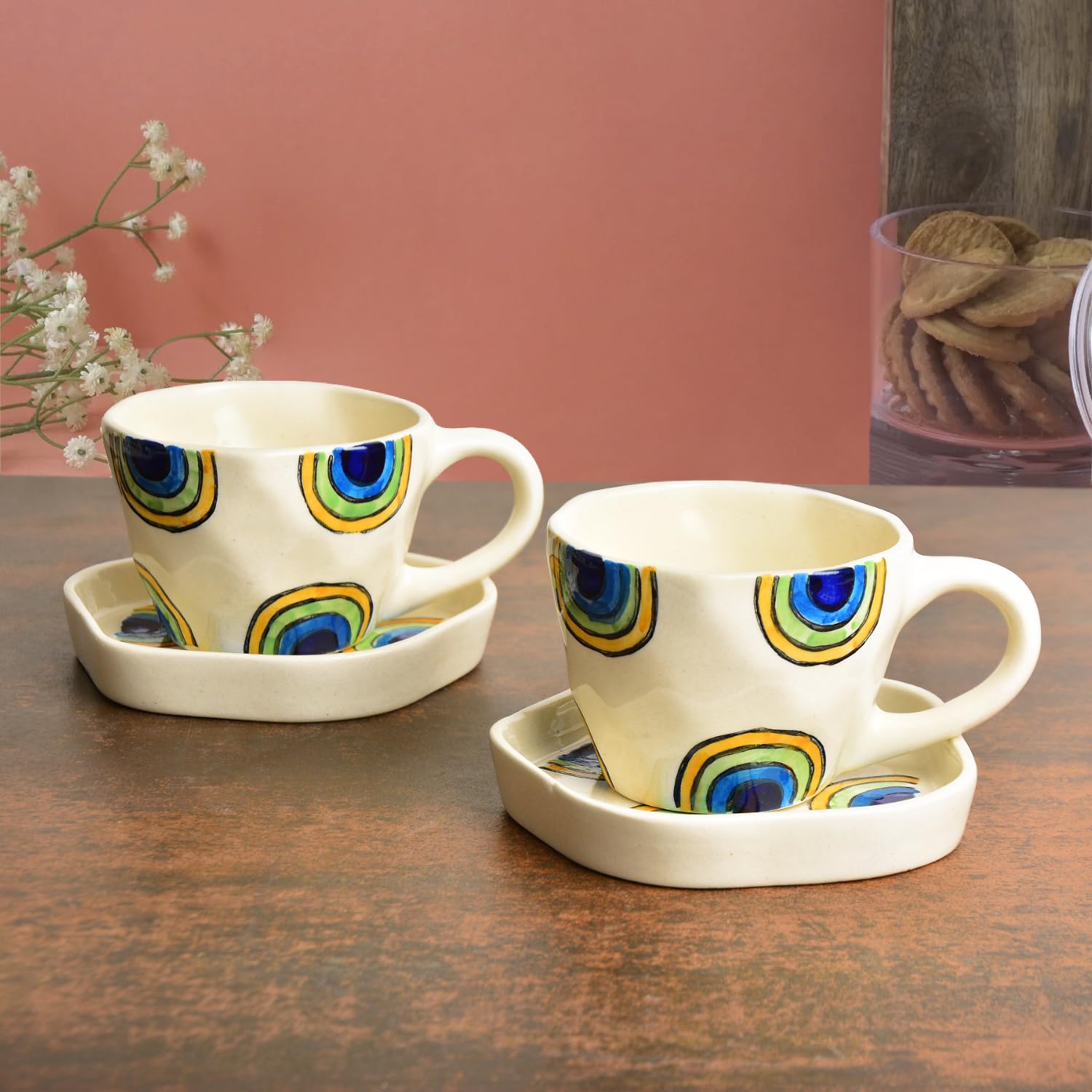 Hand Painted Ceramic Cup & Saucer Set Of 2 - Multicolor, 250ml Each | Microwave Safe Tea Cups & Mugs | Chai Cups