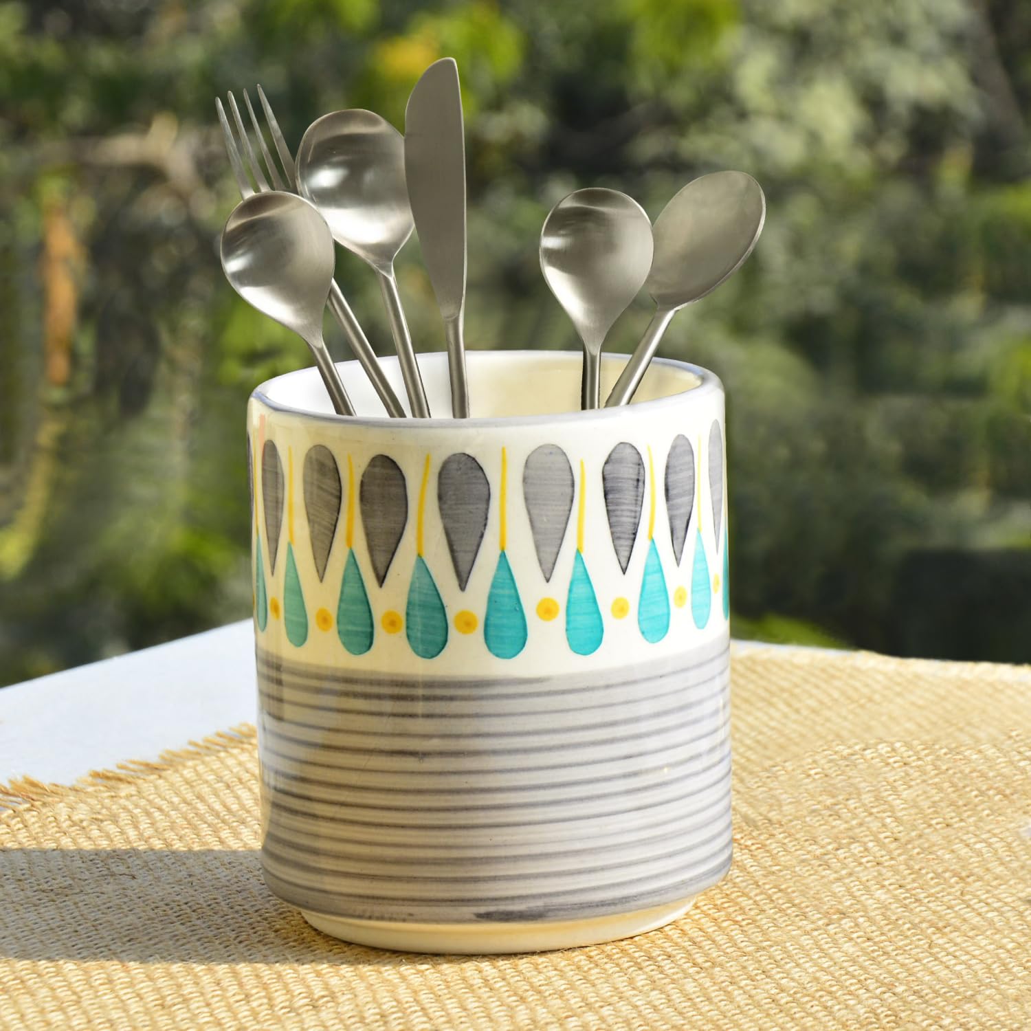 Hand Painted Ceramic Cutlery Stand - Grey, Turquoise Blue & Yellow, 600ml | Multi Utility Jar | Toothbrush Holder | Pen Stand