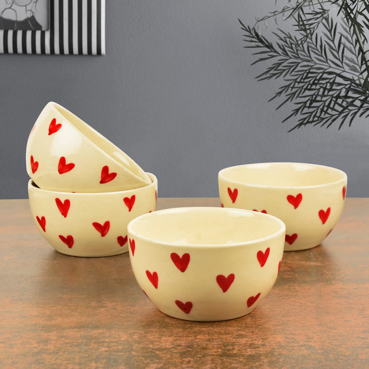 Hand Painted Ceramic Dining Bowls Set Of 4 - 350ml Each, Off White & Red | Vegetable & Dessert Serving Bowls | Katoris