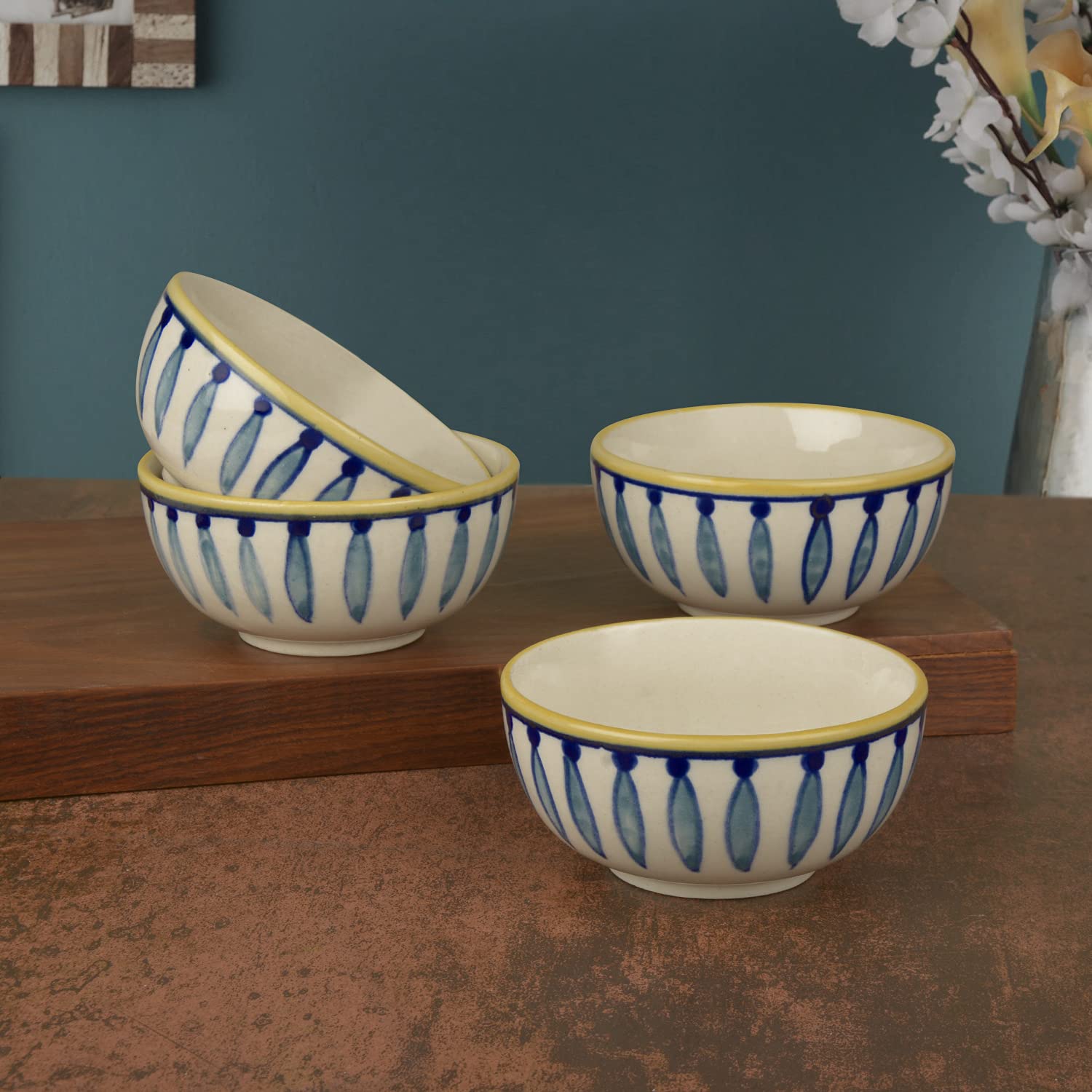Hand Painted Ceramic Dinner Serving Bowls Set Of 4 - White & Blue, 200ml Each | Salad Bowls | Vegetable & Dessert Serving Bowls | Kitchen Bowl Set