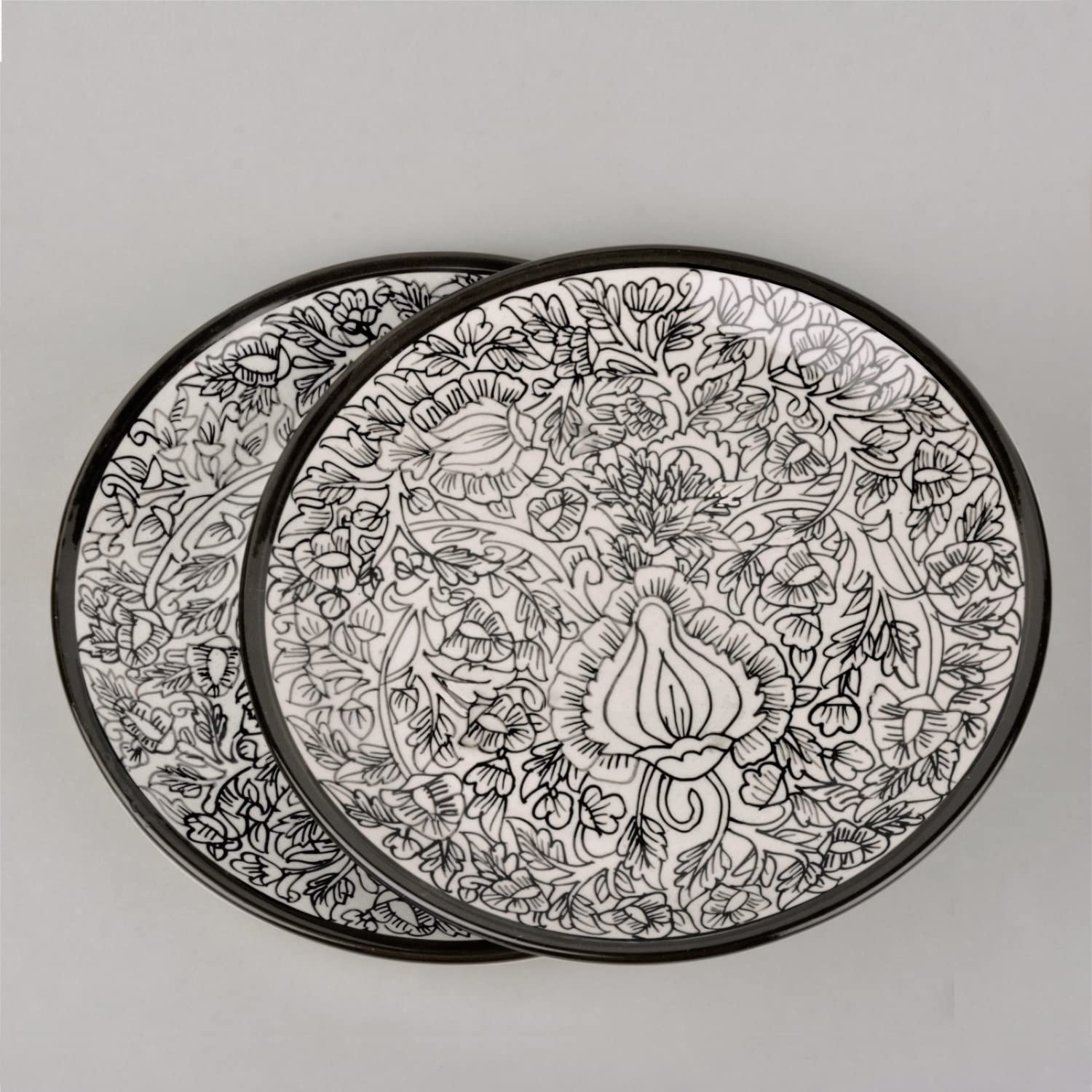 Hand Painted Ceramic Dinner Serving Plates Set Of 2 - Off White & Black, 25 Cm | Full Plates | Platter - Kalamkari Collection