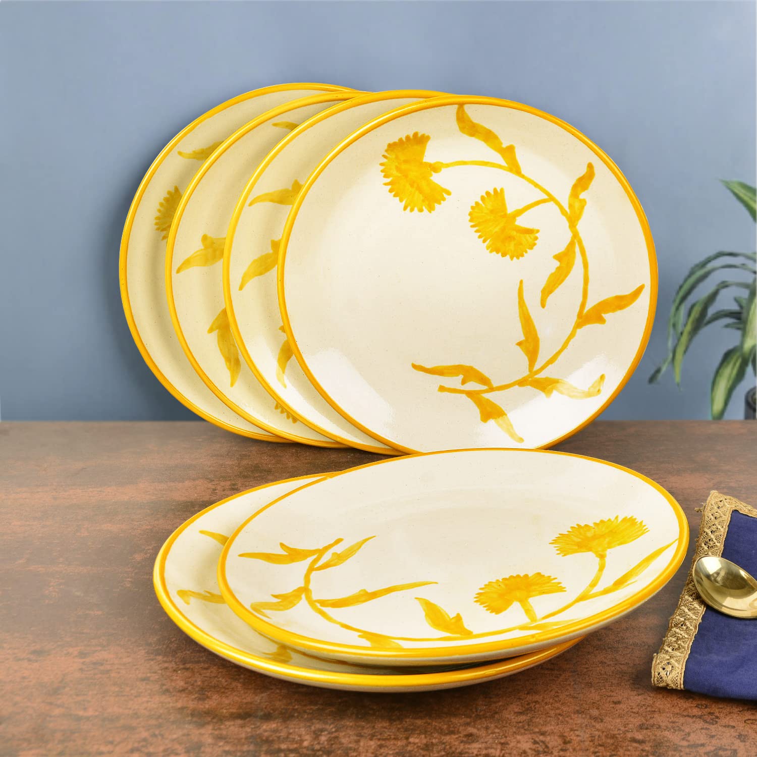 Hand Painted Ceramic Floral Dinner Serving Plates Set Of 6 - Yellow & Off White, Diameter: 10 Inches | Full Plates - The Lucid Yellow Collection