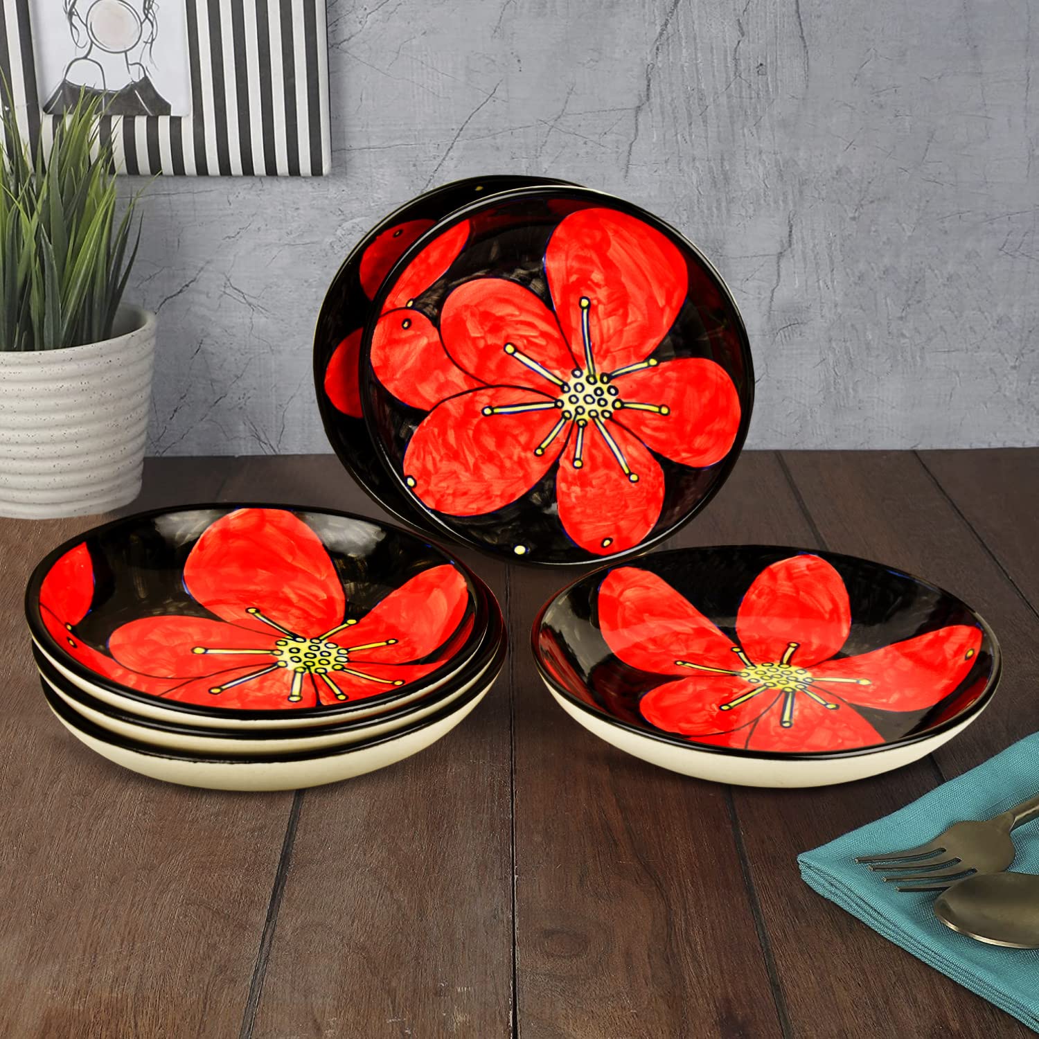 Hand Painted Ceramic Floral Round Pasta Serving Plates Set Of 6 - 8.5 Inches, Red & Black | Soup Plates | Maggi Plates
