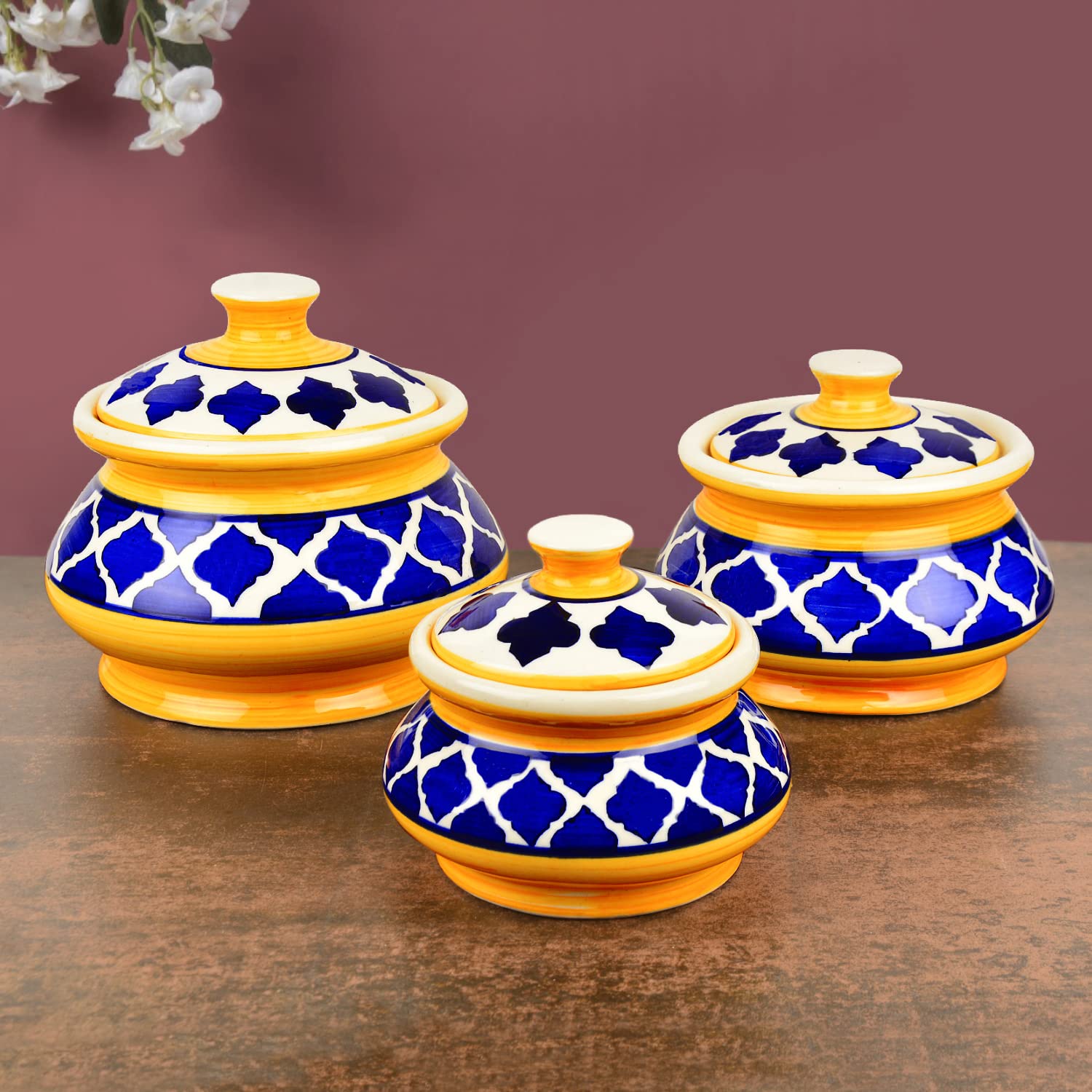 Hand Painted Ceramic Handi Set With Lid Set Of 3 - 1900ml, 1200ml & 650ml, Blue & Yellow | Dinner Serving Bowls | Biryani Handis | Serving Pots