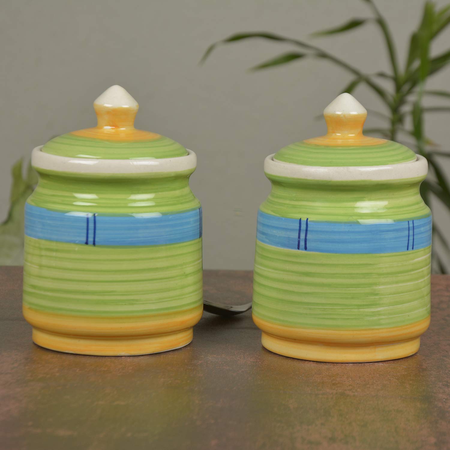 Hand Painted Ceramic Jar (Burni) Set With Lid Set Of 2 - 500ml Each, Green & Blue