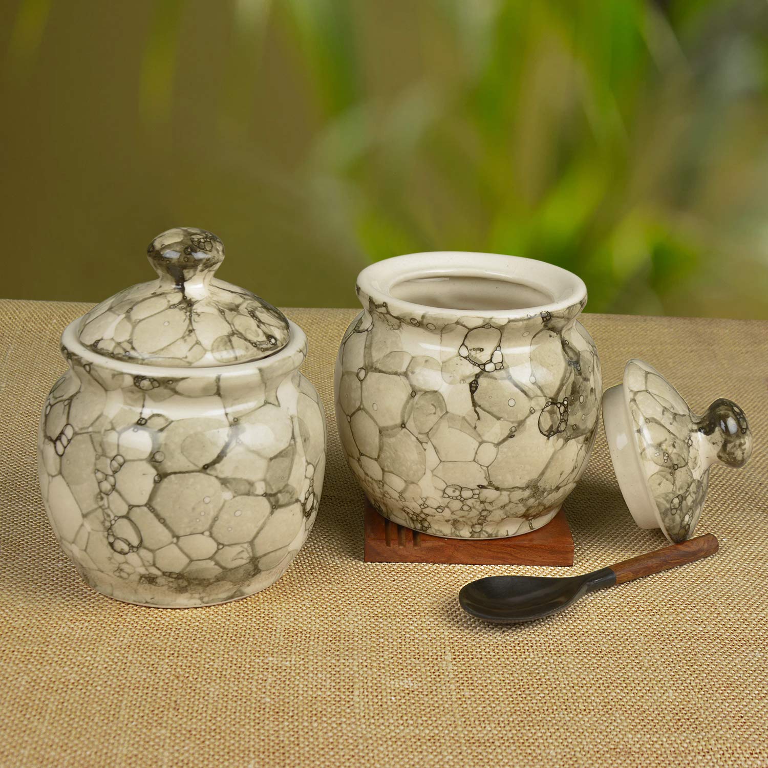 Hand Painted Ceramic Jar Set With Lid Set Of 2 - 500ml, Brown | Ceramic Multi-utility Storage Jar | Pickle Storage Jar With Lid | Burni