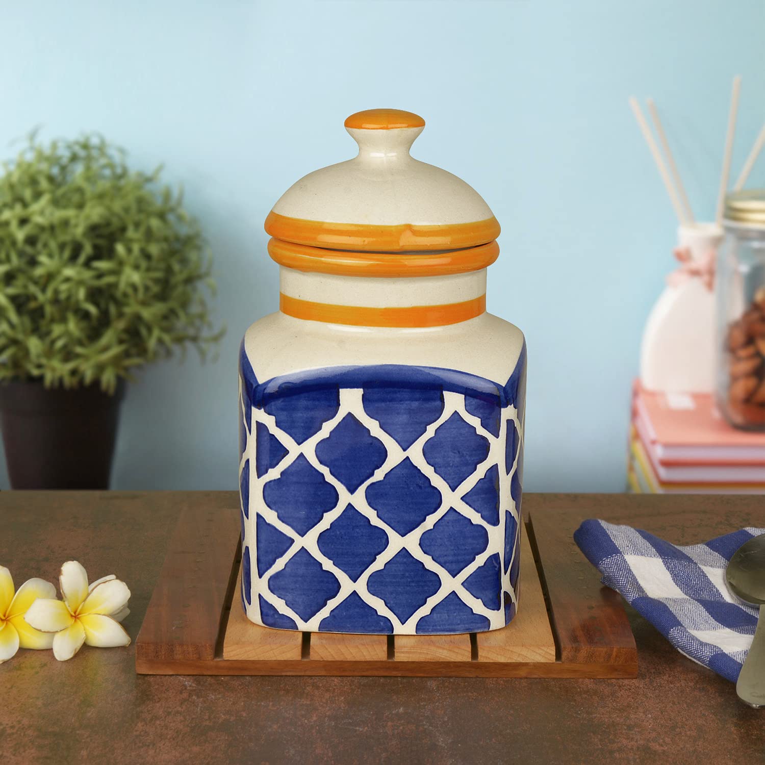 Hand Painted Ceramic Jar With Lid 1200ml, Blue & White | Multi Utility Storage Container | Pickle Storage Jar | Burni
