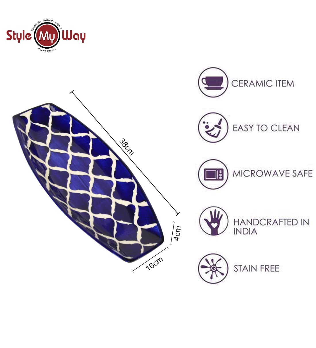PACKAGE CONTENTS : 1 Ceramic Platter ; DIMENSIONS : (L x B x H – 38 cm x 16 cm x 4 cm), Weight – 700 gm