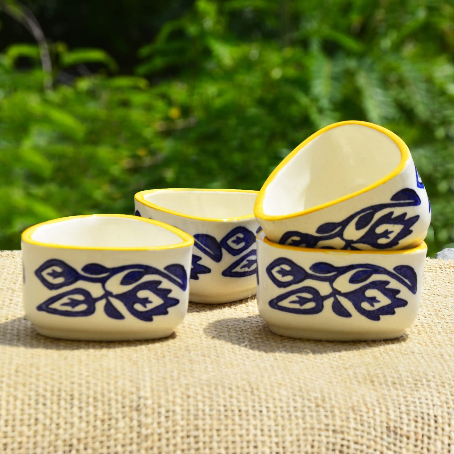 Hand Painted Ceramic Triangular Floral Dip Bowls Set Of 4 - Blue & Yellow, 50ml Each | Chutney Bowls | Ketchup Bowls