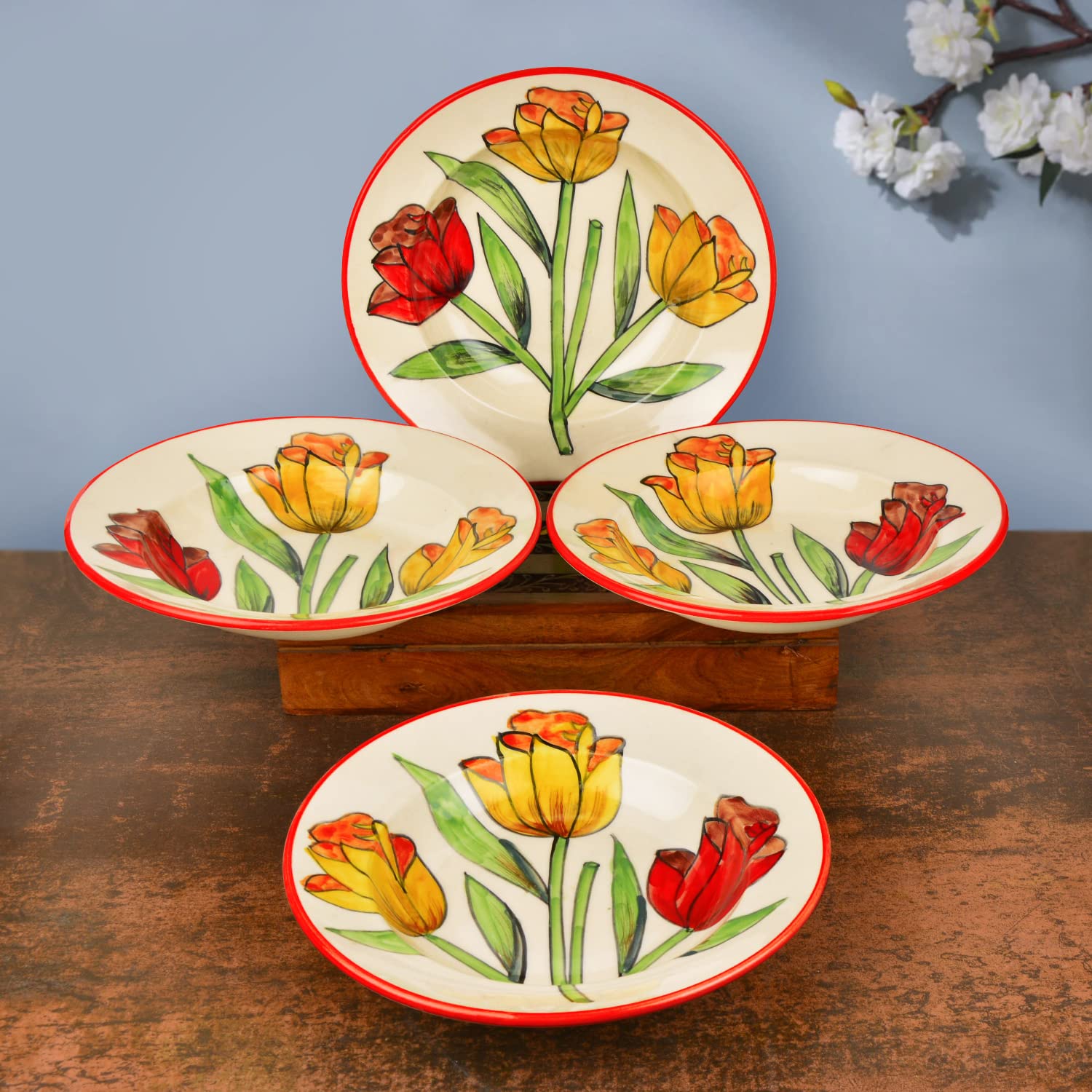Hand Painted Premium Ceramic Floral Deep Pasta Plates Set Of 4 - Diameter: 9.5 Inches, Multicolor & Off White | Soup Plates | Maggi Plates