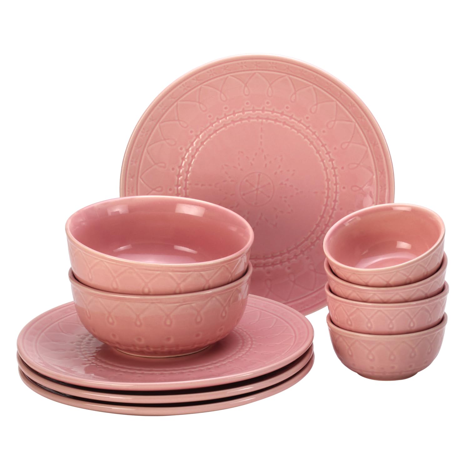 Handcrafted Ceramic Dinner Set Of 10 Pcs With Serving Bowls Set, Light Pink | 4 Dinner Plates + 4 Small Dinner Bowl, 180ml Each + 2 Serving Bowl, 1000ml Each | Dishwasher Safe - Serving For 4