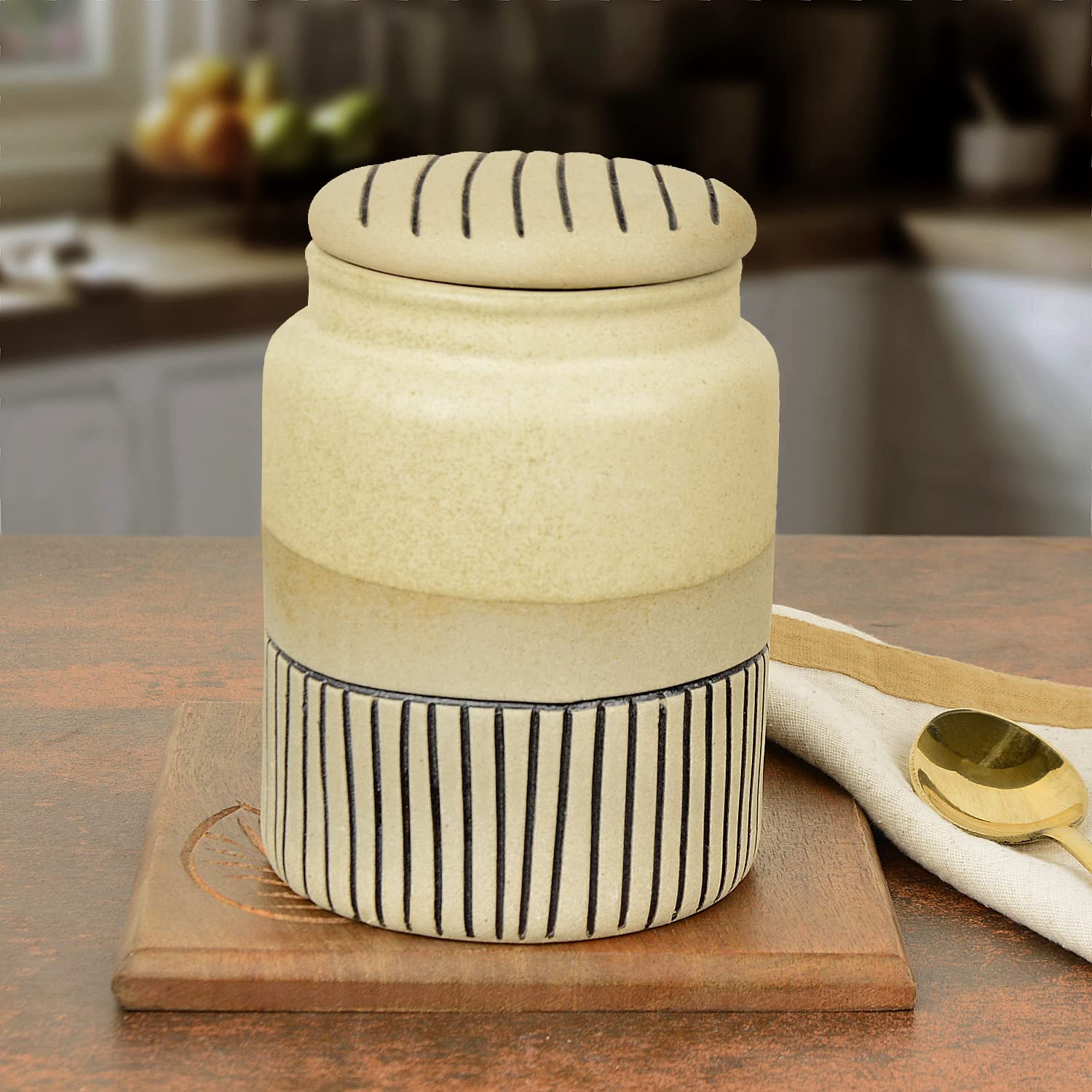 Handcrafted Ceramic Striped Jar With Rustic Look & Lid 700ml, Off White & Blue | Multi Utility Storage Container | Pickle Storage Jar | Burni