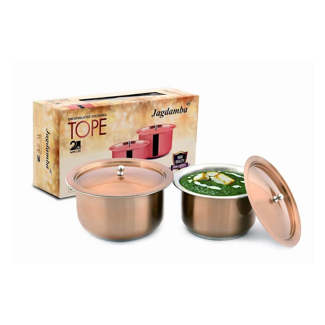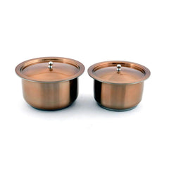 High Grade Stainless Steel Copper Tope With Lid Set Of 2 Pcs | Copper Coating & Inside Silver Color, Size 16 Cm, 1.1 Liters + 18 Cm, 1.6 Liters