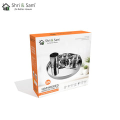 This Shri and Sam thali set is hand hammered and is made from premium quality stainless steel that can last a very long time. This thali set has a shiny finish which can make it look great on any type of table. This thali set is perfect for 1 person. This can be a great add on to your dinnerware collection. This product can also be gifted to anyone on different occasions. This dinnerware set is a great option to serve your guests or friends. If you care to sit with your family and have a warm meal then this thali set is good for you. Its hammered finish makes it look elegant and gives it a royal finish.