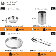 High Grade Stainless Steel Komcha Hammered Thali Set Of 5, Silver - Mirror Finish | 1 Hammered Thali+ 2 Bowls+ 1 Glass+ 1 Dessert Spoon