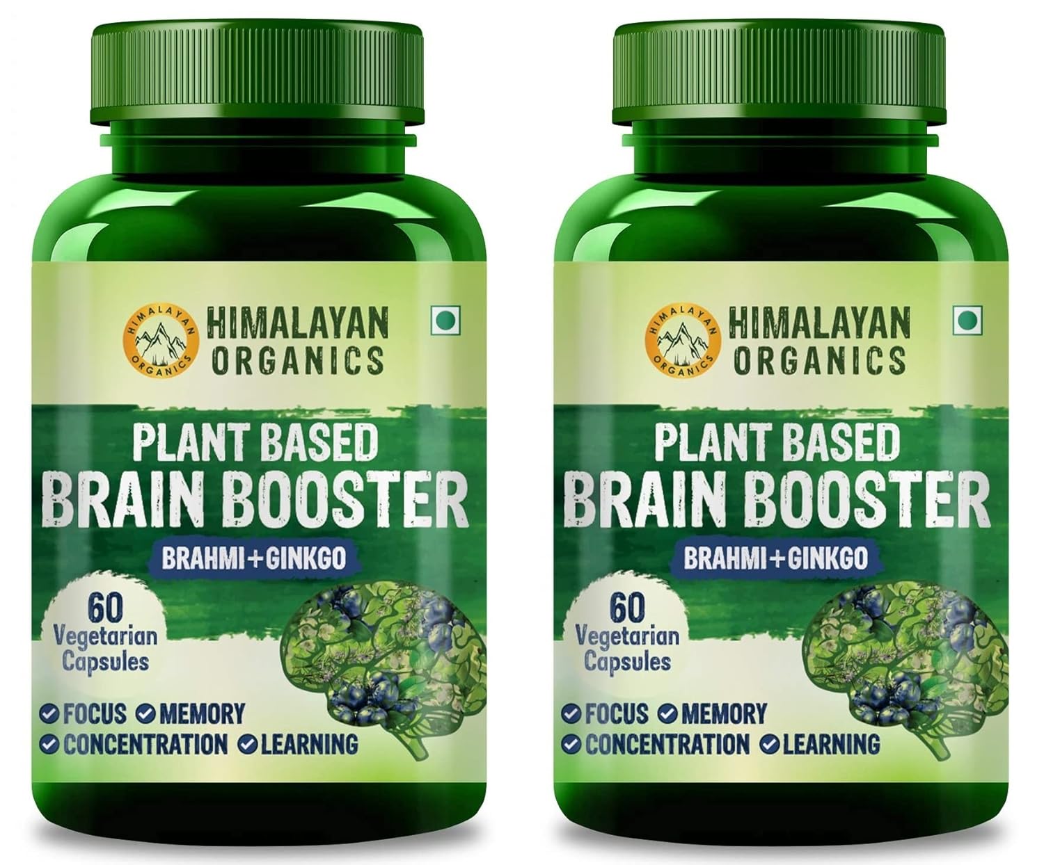 Himalayan Organics Plant Based Brain Booster Supplement With Ginkgo Biloba & Brahmi, Healthy Brain, Stress Relief, Improve Focus | 60 Veg Capsules 100gm 0.2lbs Each Pack Of 2