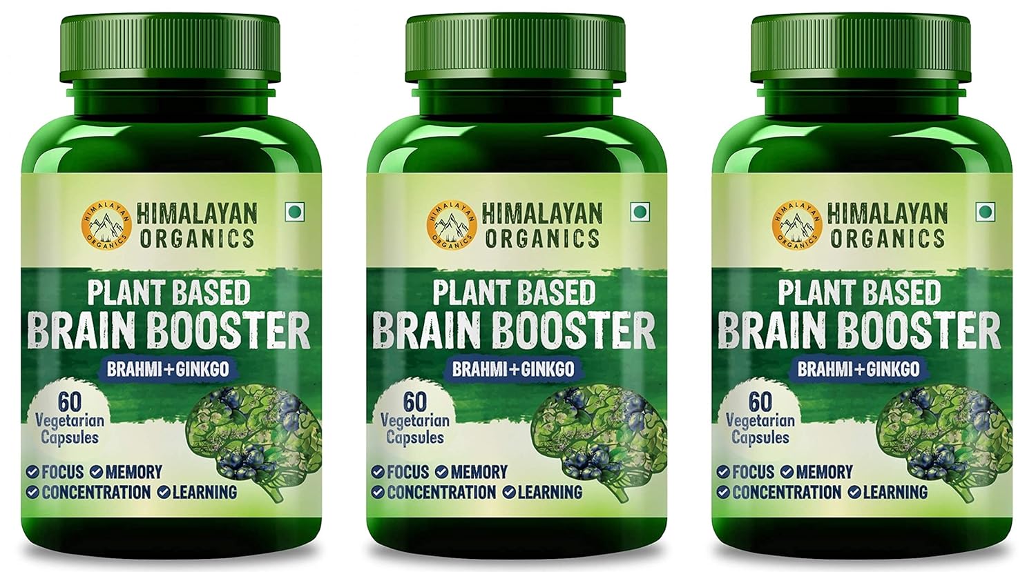 Himalayan Organics Plant Based Brain Booster Supplement With Ginkgo Biloba & Brahmi, Healthy Brain, Stress Relief, Improve Focus | 60 Veg Capsules 100gm 0.2lbs Each Pack Of 3