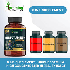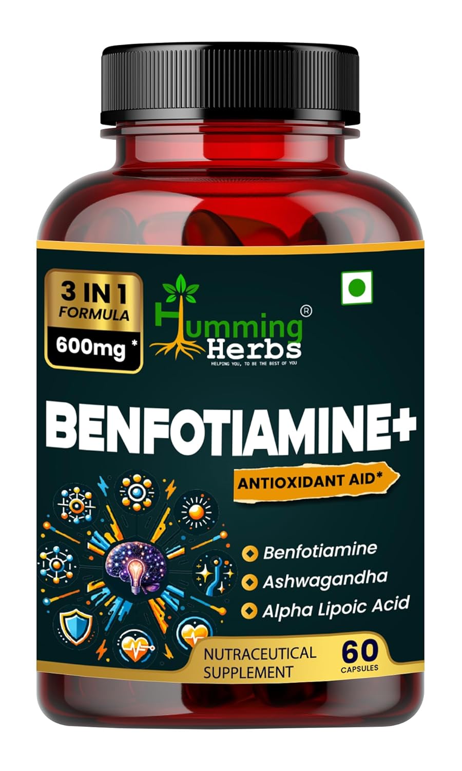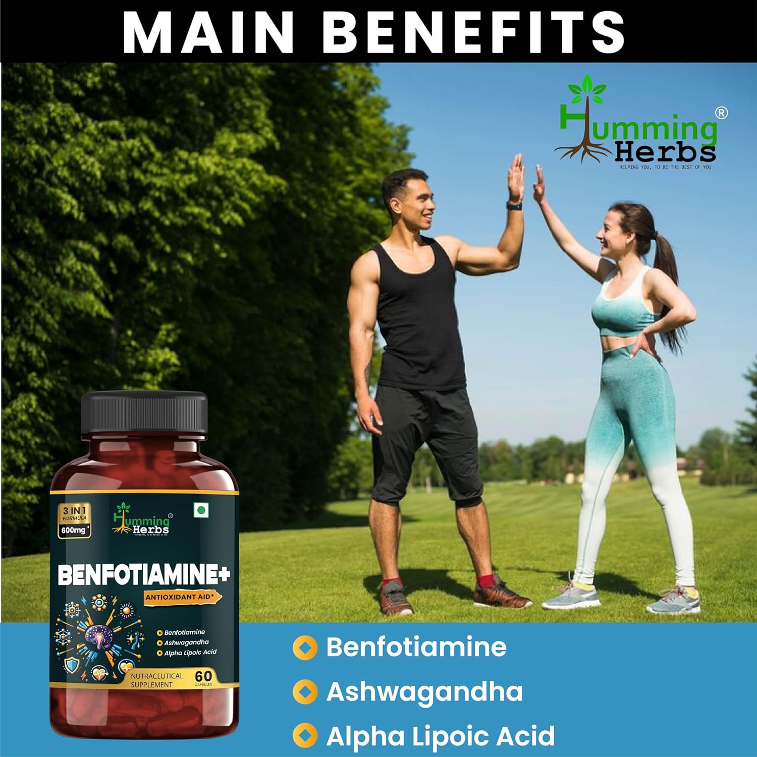 Humming Herbs Benfotiamine+ 600mg With Ashwagandha & Alpha Lipoic Acid Antioxidant & Energy Support, Promotes Nerve Health & Metabolic Function, Nutraceutical Supplement | 60 Capsules 100gm 0.2lbs