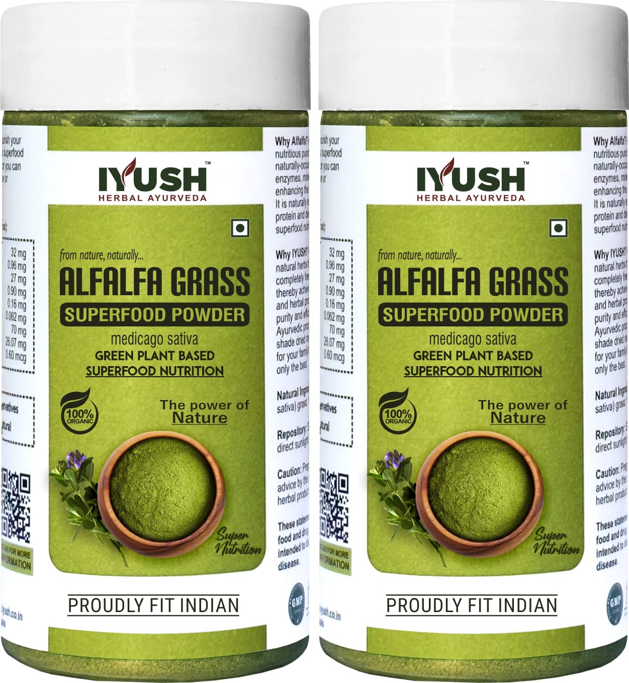 Iyush Herbal Ayurveda Alfalfa Superfood Powder, 100% Forest Variety Herbs, 100% Organic, Pure & Natural | 100gm 0.2lbs Each Pack Of 2